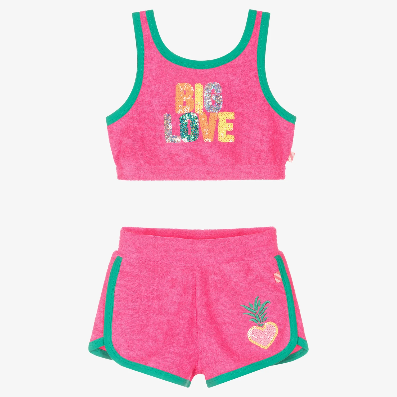 Sporty and fun, a bright pink towelling shorts set for girls by Billieblush. The cropped top shimmers with the words ‘Big Love’, whilst the shorts have a coordinating sequinned and embroidered pineapple on one side. The set is trimmed in contrasting green jersey and has the brand’s striped pink logo tabs on the side seams. Easy to wear, both pieces simply pull on.