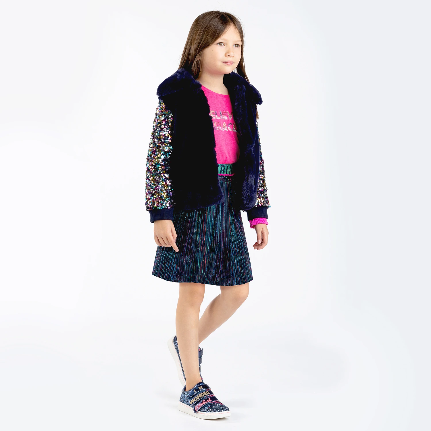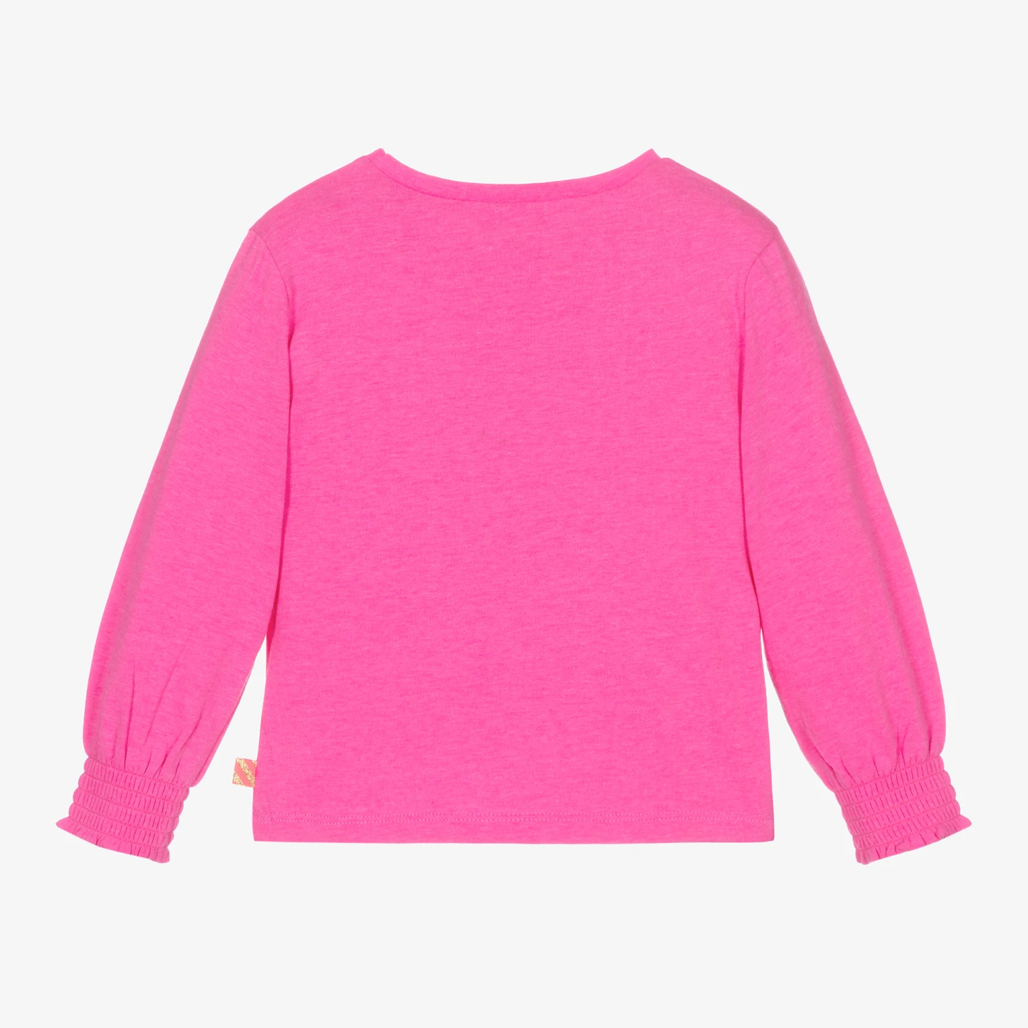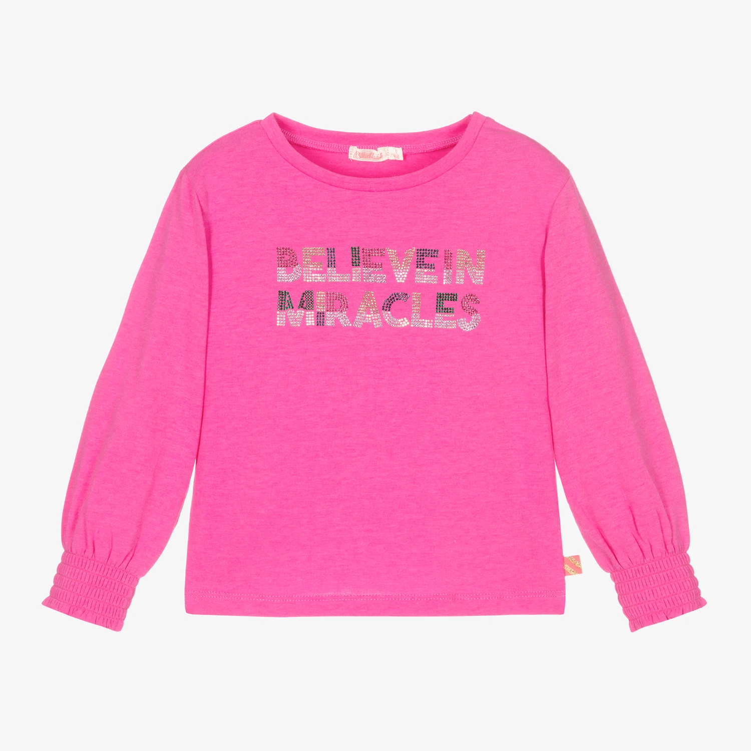 Girls fuschia pink top by Billieblush, made in soft and stretchy cotton jersey. It has the words ‘Believe in Miracles’ in colourful rhinestones across the front. The long sleeves have a ruffled, elasticated cuff.
