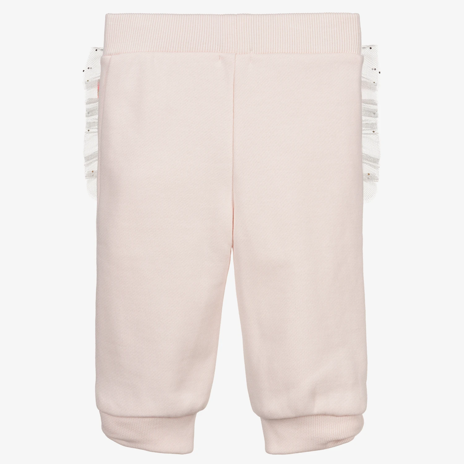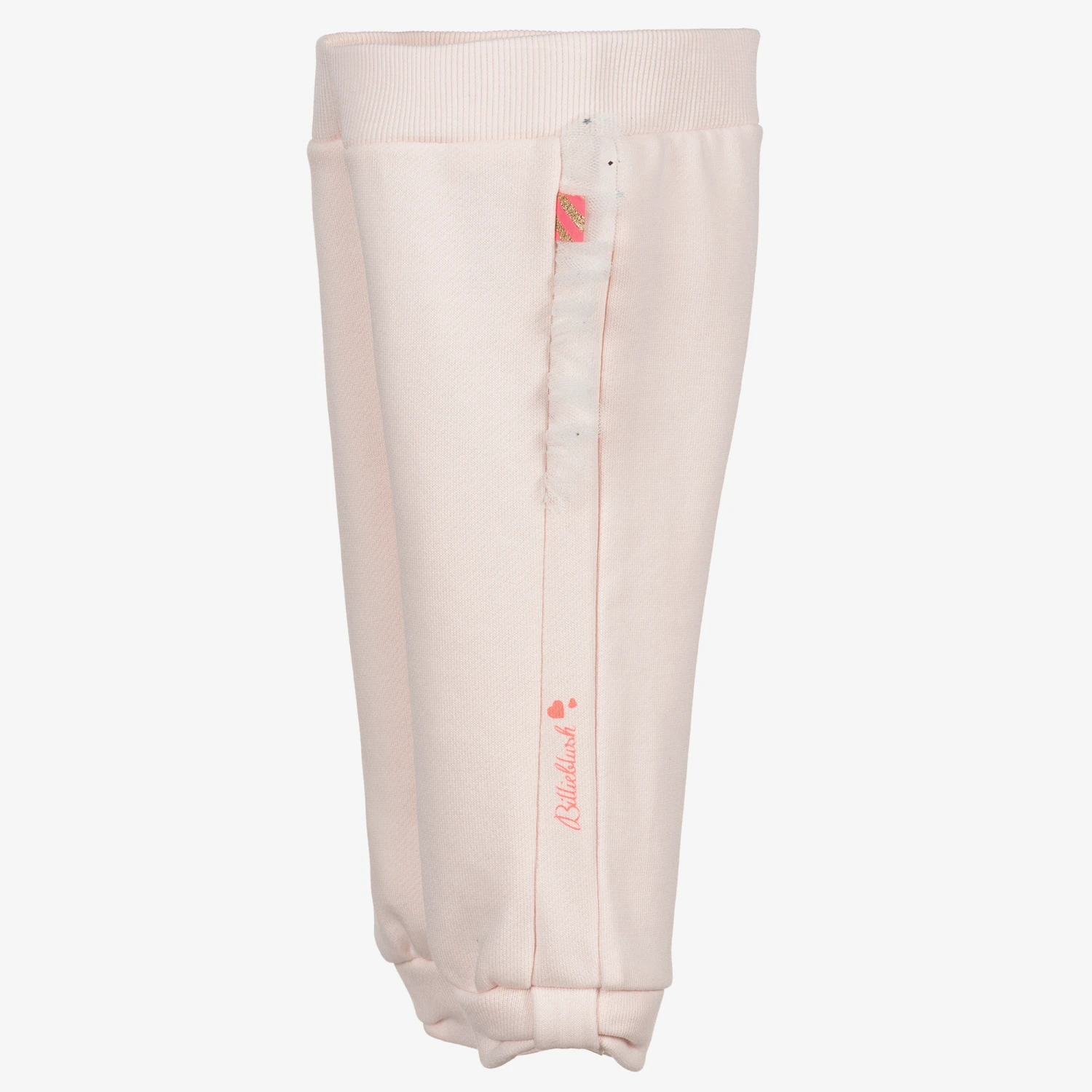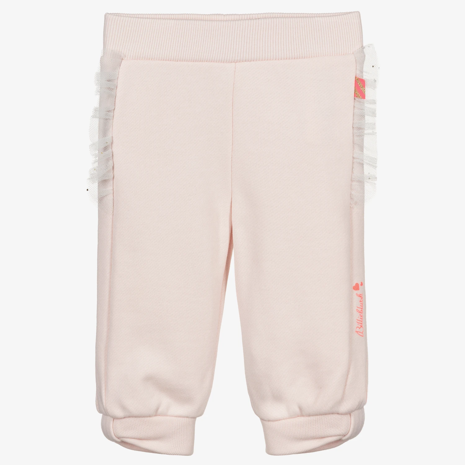 Pale pink joggers for younger girls by Billieblush, made in soft cotton sweatshirt jersey. They have white tulle trim on the side seams and a neon pink logo print on one side.
