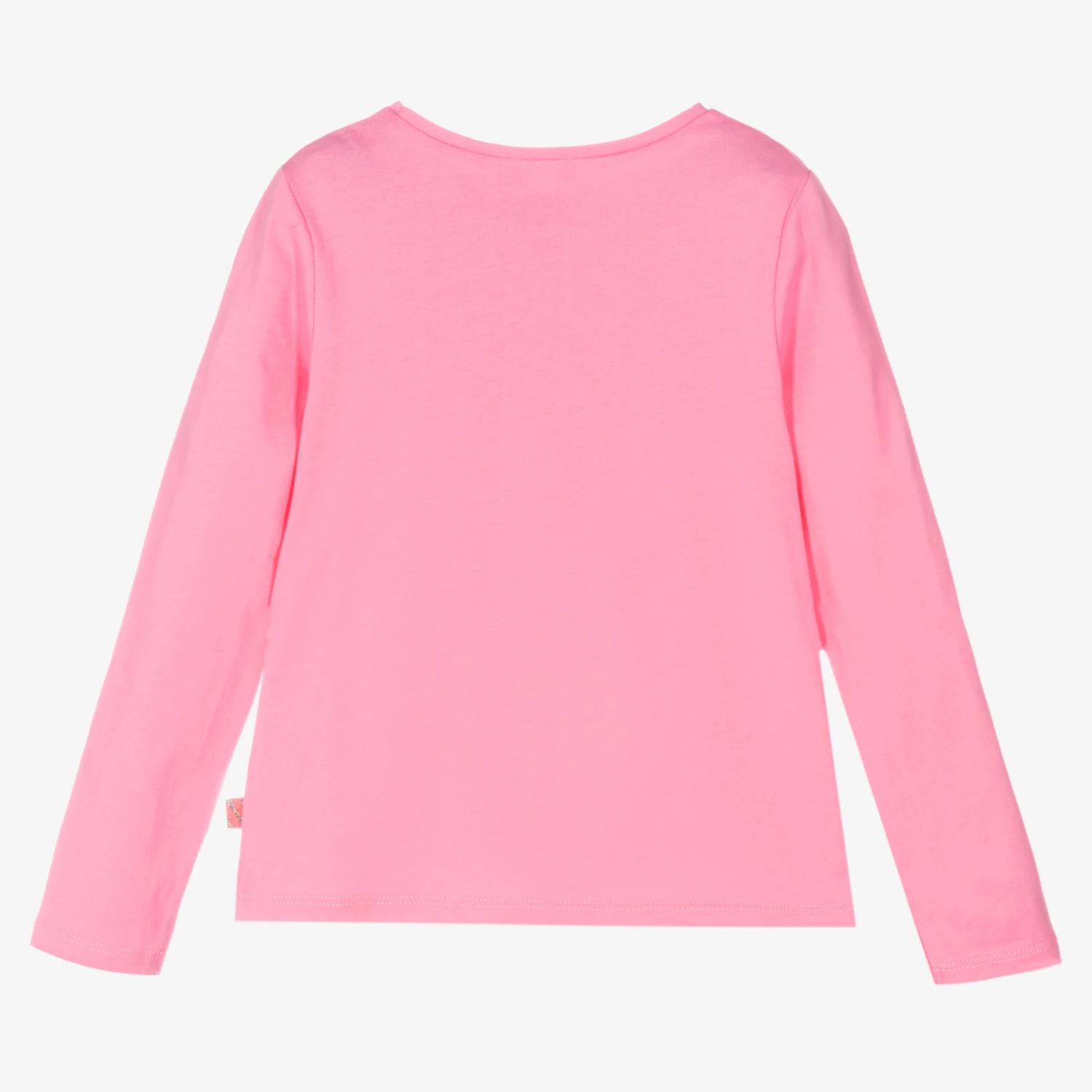 Pink top for girls by Billieblush, made in soft and comfortable cotton jersey. The front has a glittery logo print with stars, in blue, gold and white.