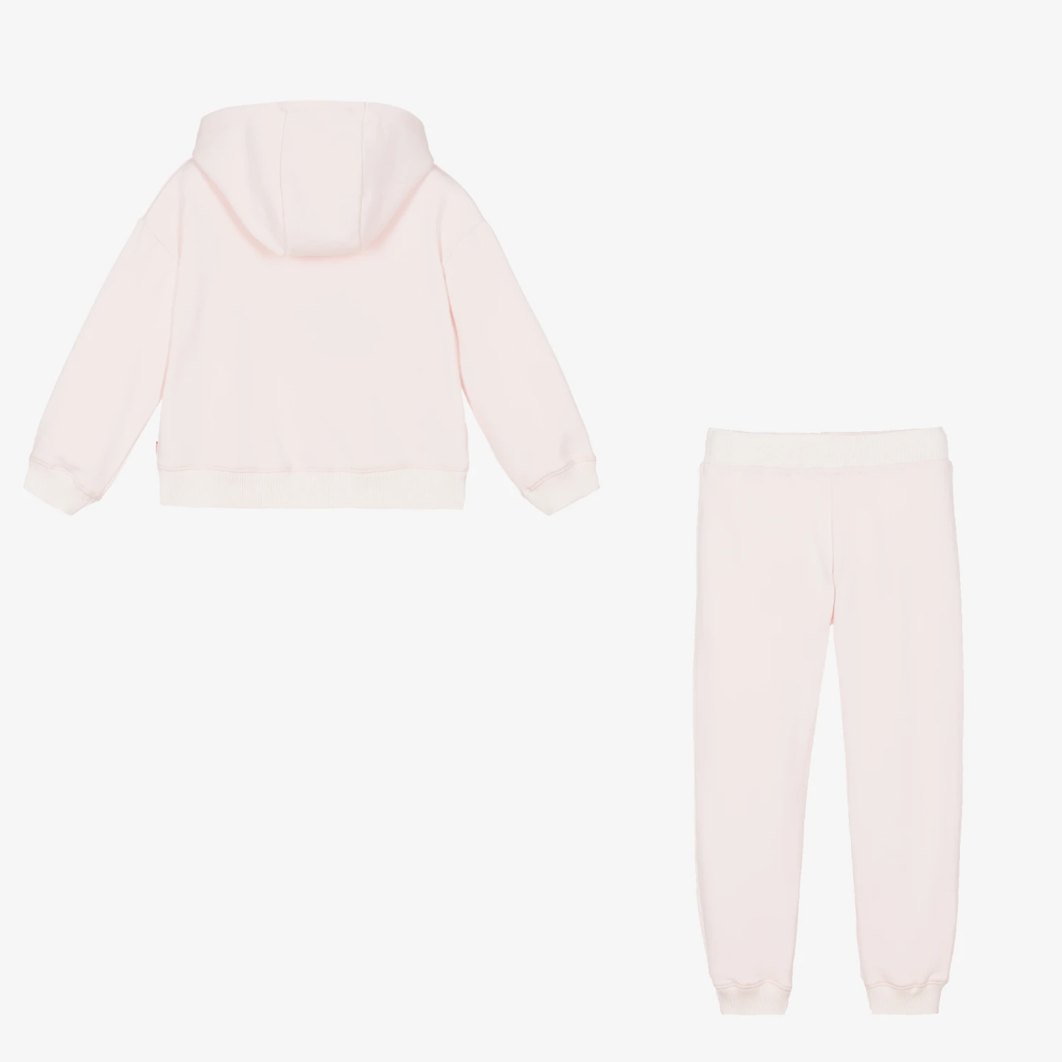 Pink cotton tracksuit for girls by Billieblush, with a varsity vibe and sparkly ribbed trims with a delicate shimmer. Made in comfortable jersey, the zip-up hoodie has ‘LOVE’ printed on the front in glittery green and neon pink lettering. It has a zip fastening with a logo pull tab and useful, concealed pockets on the seams, with the brand’s signature tag logo on one side. The matching joggers have a comfortable elasticated waistband.