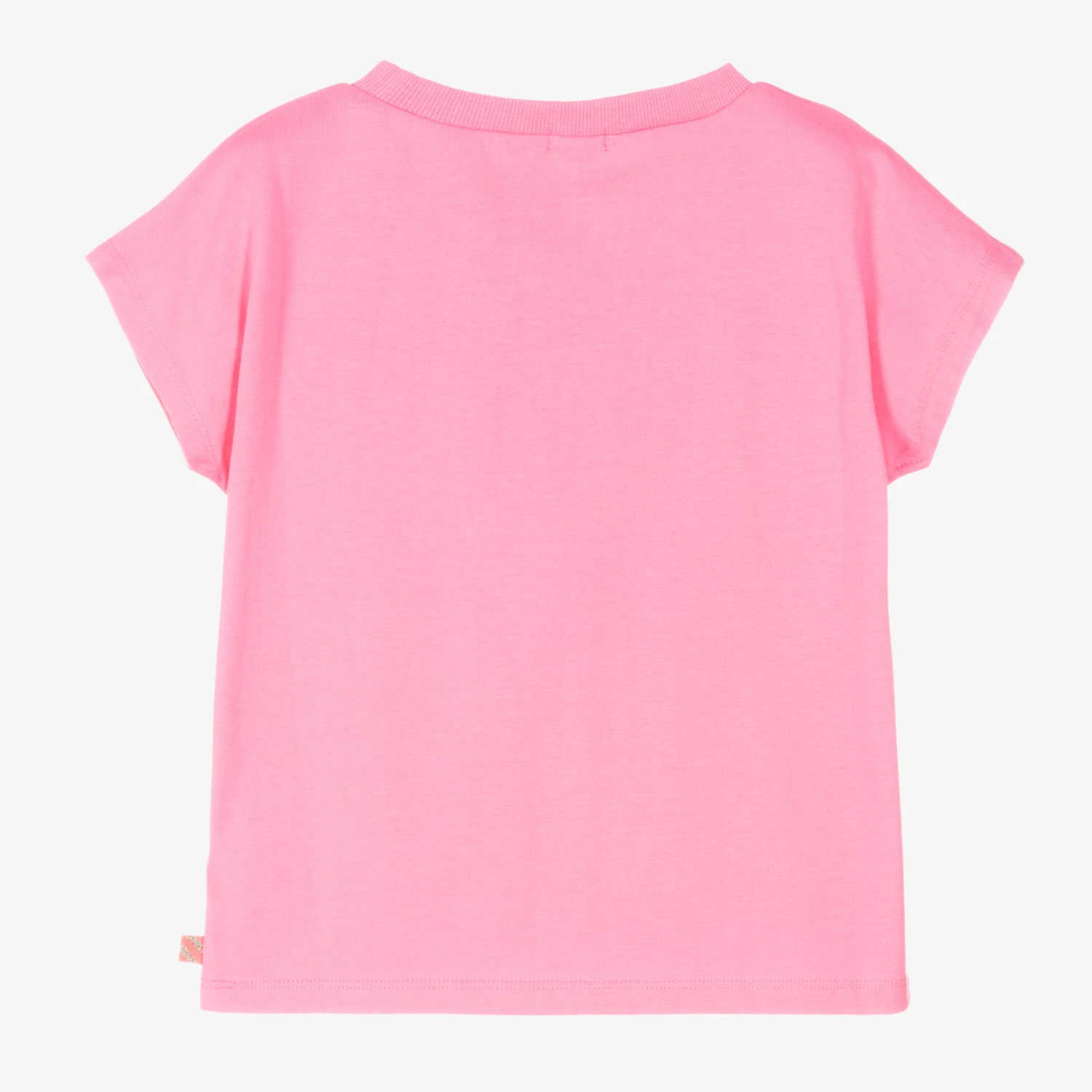 Fun pink cotton jersey T-shirt for girls by Billieblush. It has a raised peacock print on the front in pink, gold, yellow and blue with a ‘Chill’ slogan.