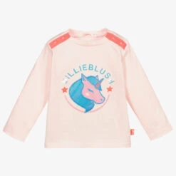 Pale pink top for younger girls by Billieblush, made in soft and stretchy cotton jersey. It has a lovely unicorn logo design in neon pink, lilac purple and iridescent silver. The shoulders have neon pink grosgrain ribbon trims, with button fastenings.