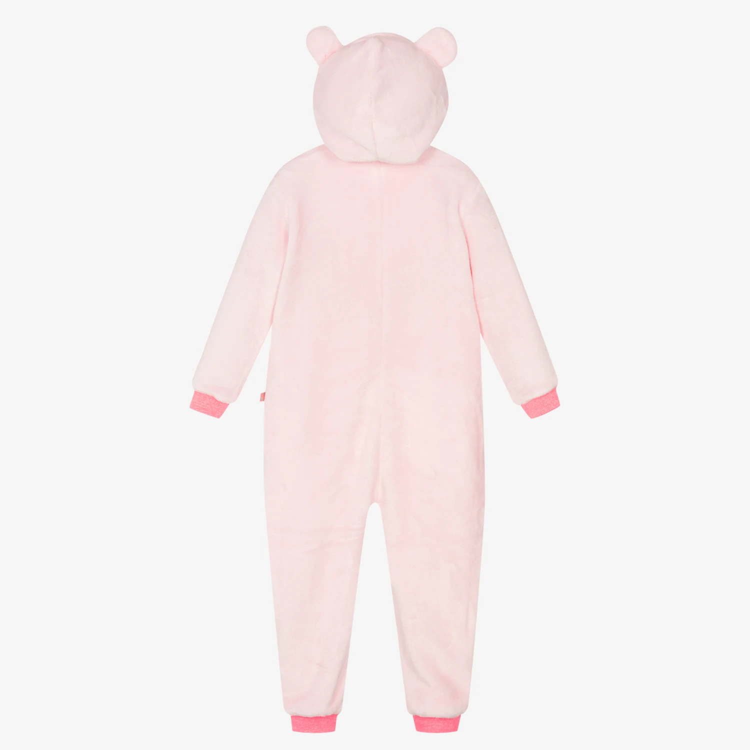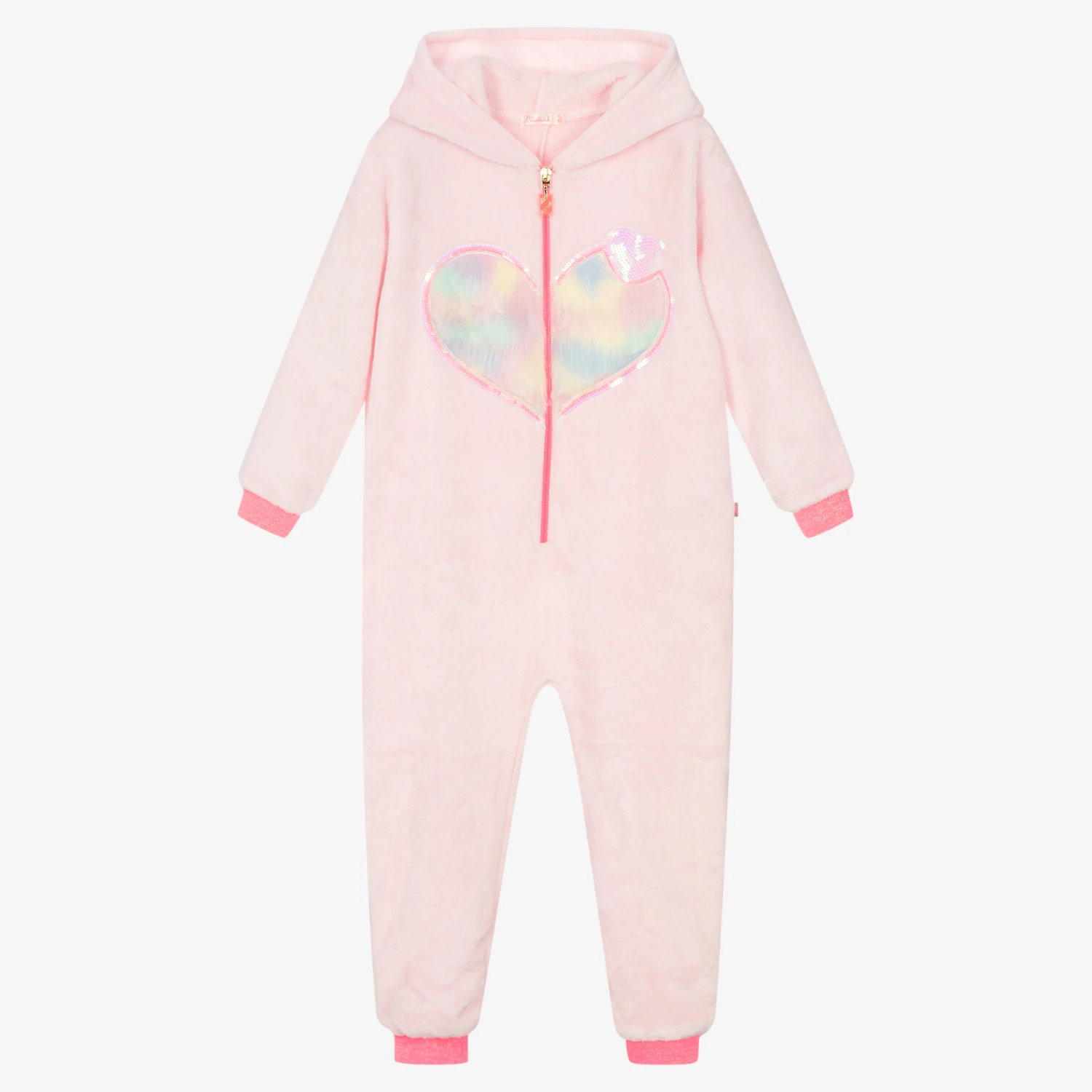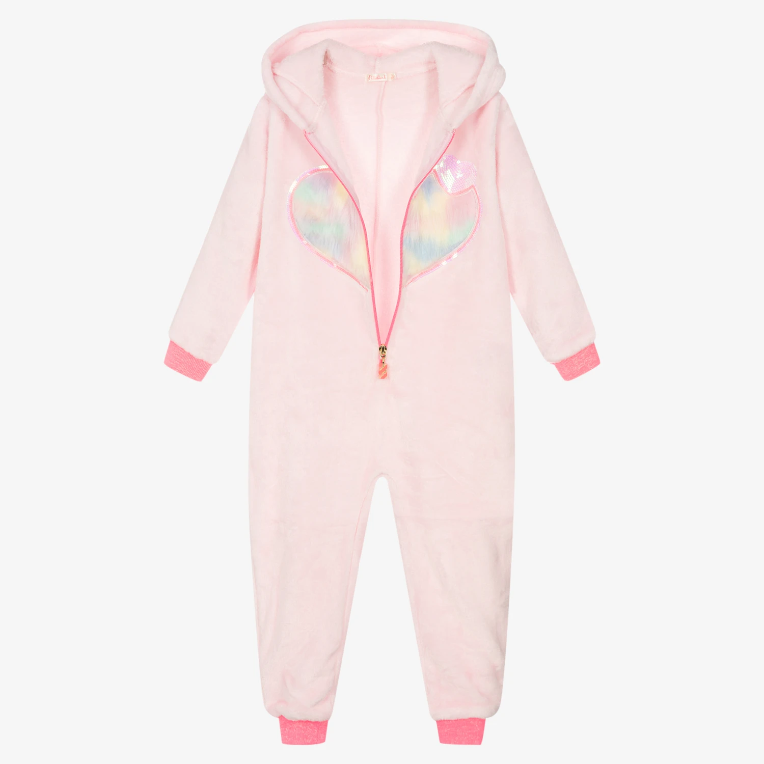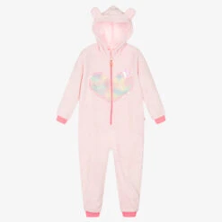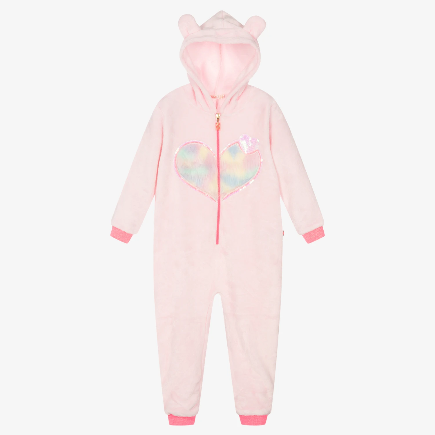 Super soft plush faux fur onesie for girls by Billieblush, in a pretty shade of pale pink. Combining fun with cosy comfort, this hooded romper has a faux fur heart appliquΓ© on the front in a variation of pastel colours. It fastens easily with a neon pink zip down the front.
