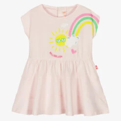 Light and airy pink sleeveless dress for girls by Billieblush, made in soft, breathable cotton jersey. It has a vibrant sunshine and rainbow print on the chest, with the brand’s signature tag logo on the side. Popper fastenings on the back ensure that dressing is easy.