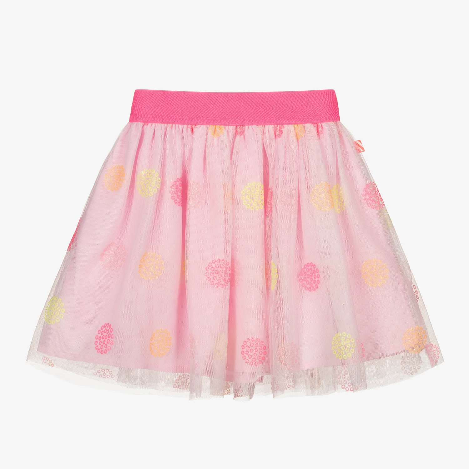Girls pink tutu skirt by Billieblush. It is made in soft tulle with a lovely dotted design in neon pink, orange and yellow with glitter accents. Lined with soft, lightweight voile, it has a neon pink elasticated waistband.