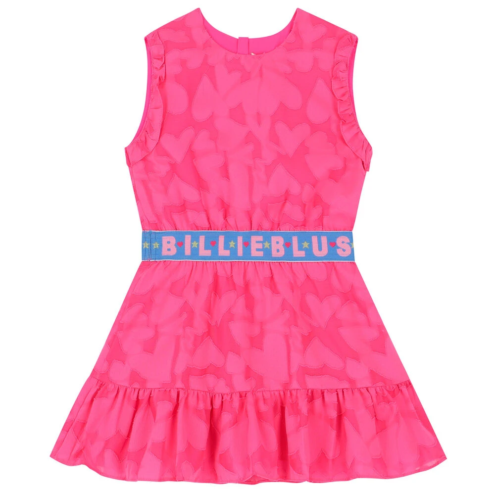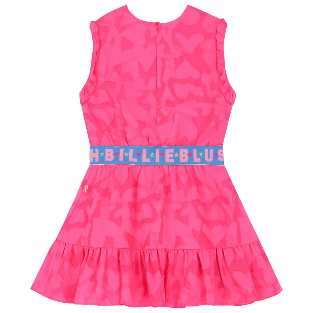 Pink dress for girls by BILLIEBLUSH. Made from soft silky polyester, it features an all-over tonal heart pattern and ruffled trims to the shoulders. It has a blue elasticated waistband with the brands logo, hearts and stars repeated pattern. It fastens with zip at the back and is fully lined for comfort.