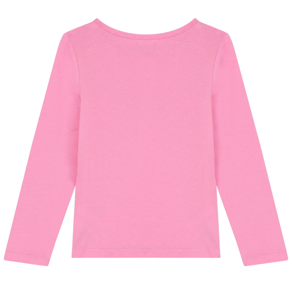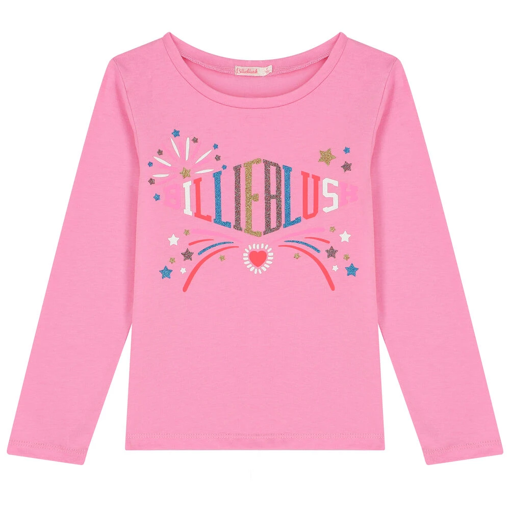 Pink logo long sleeve top for girls by Billieblush. Made from soft cotton, it features the brands logo print with sparkling glitters on the front.