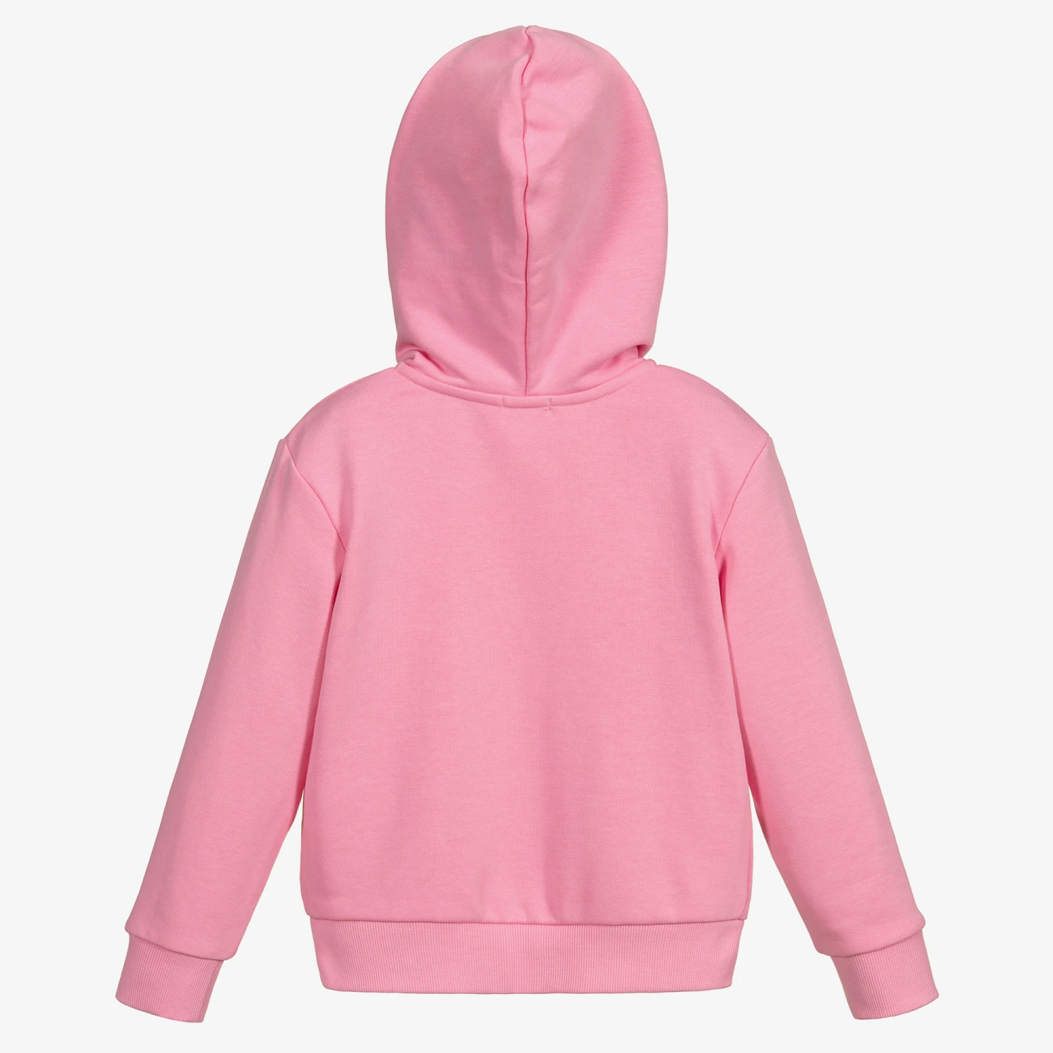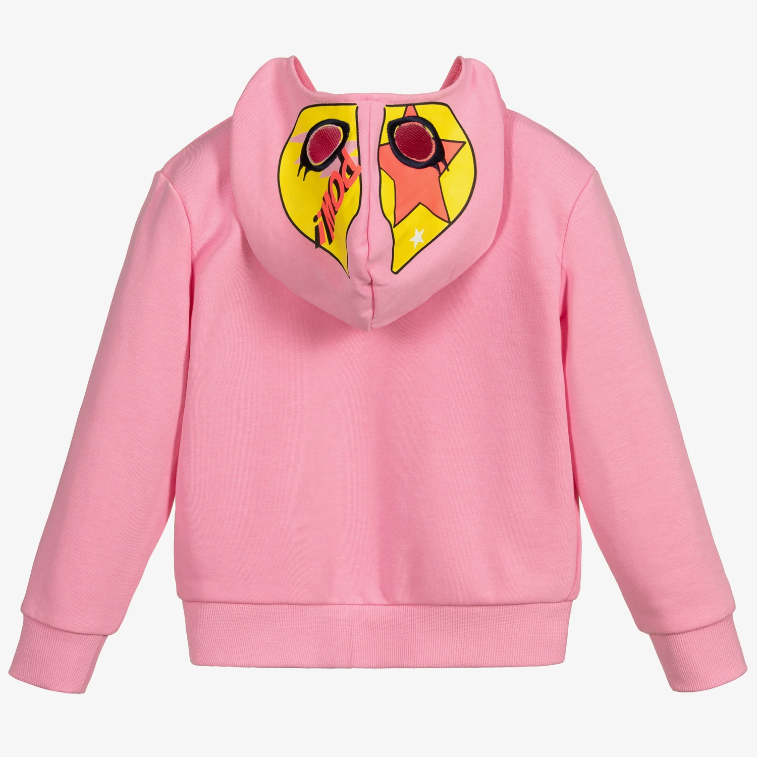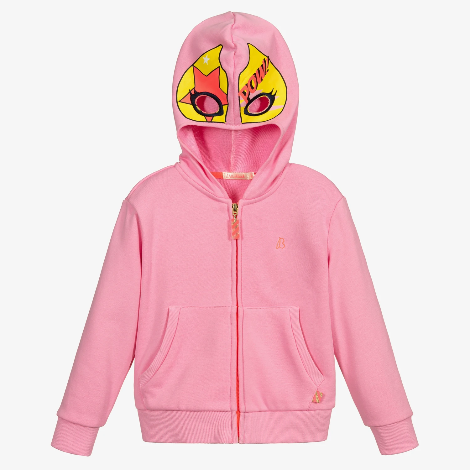 Pink zip-up top for girls by Billieblush. It is made in soft cotton jersey and has pouch pockets on the front. The hood has a fun superhero mask in pink and yellow, with cut out holes for the eyes.