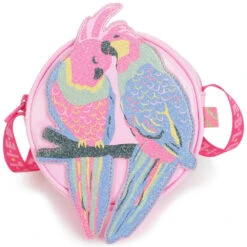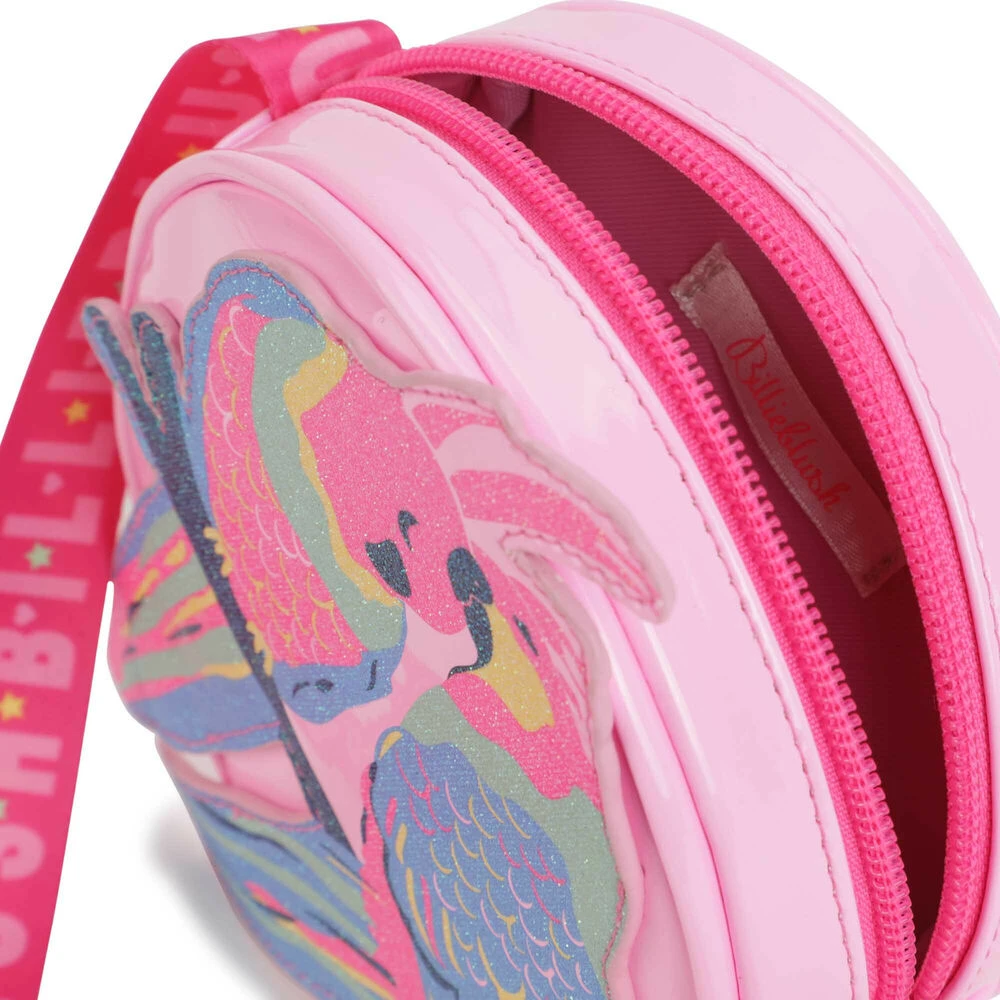 Pink handbag for girls by Billieblush. Made from patent faux leather, it features two applique glittery parrrots on the front, fastens with a top zip and has a neon pink glittery repeated logo fabric strap.