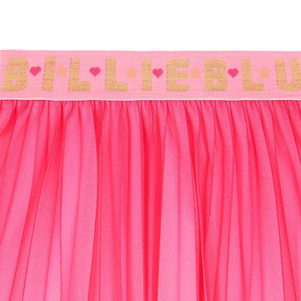 Pink pleated skirt for girls by BILLIEBLUSH. Made from soft silky polyester, it features a branded elasticated waistband with stars and hearts pattern.