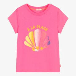 Bright neon pink T-shirt for girls, by Billieblush. Made from soft cotton jersey, it has a cute and colourful glittery sea shell print on the front.