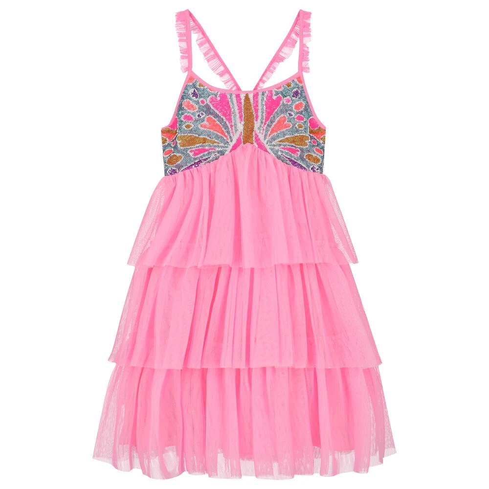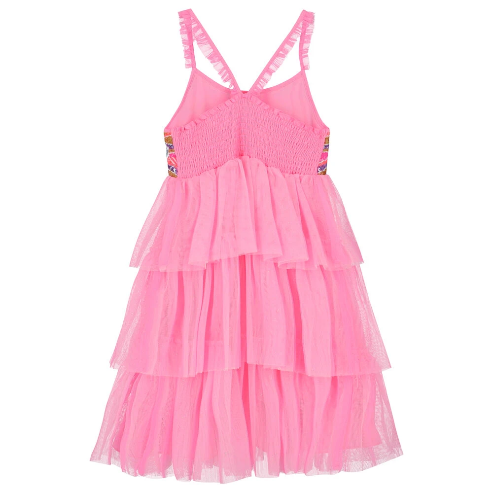 Pink dress for girls by BILLIEBLUSH. Made from layers of glittery pink soft tulle with an embellished colourful sequin panel on the front. It has pleated layered, ruffled trims on the straps and an elasticated shirred back.