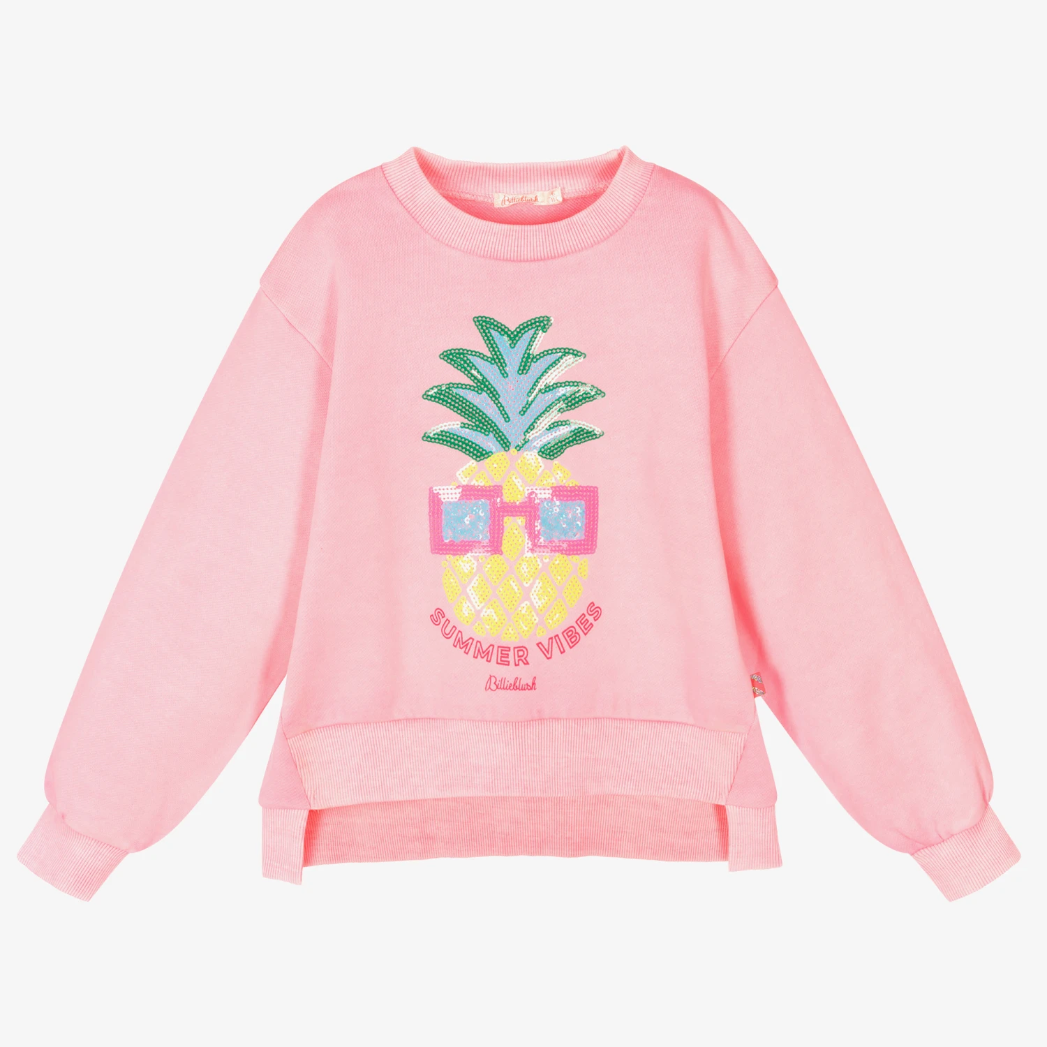 Fun pink cotton sweatshirt for girls by Billieblush, shimmering with a sequinned pineapple on the front. Made in comfortable jersey, it is printed with the brand’s logo and the words ‘Summer Vibes’. It has ribbed trims around the neck, cuffs and hemline, which is shorter on the front.