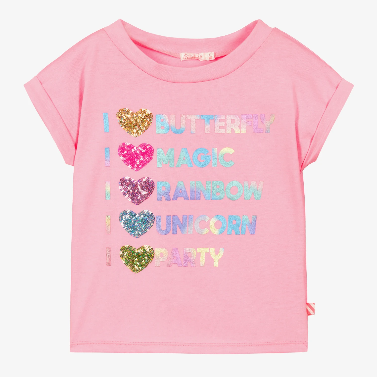 Bright pink cotton blend T-shirt for girls by Billieblush, with iridescent quotes and sequinned hearts on the front. Just right for brightening up relaxed days, it is made in stretchy, comfortable jersey and has cute, fixed turn-up cuffs.