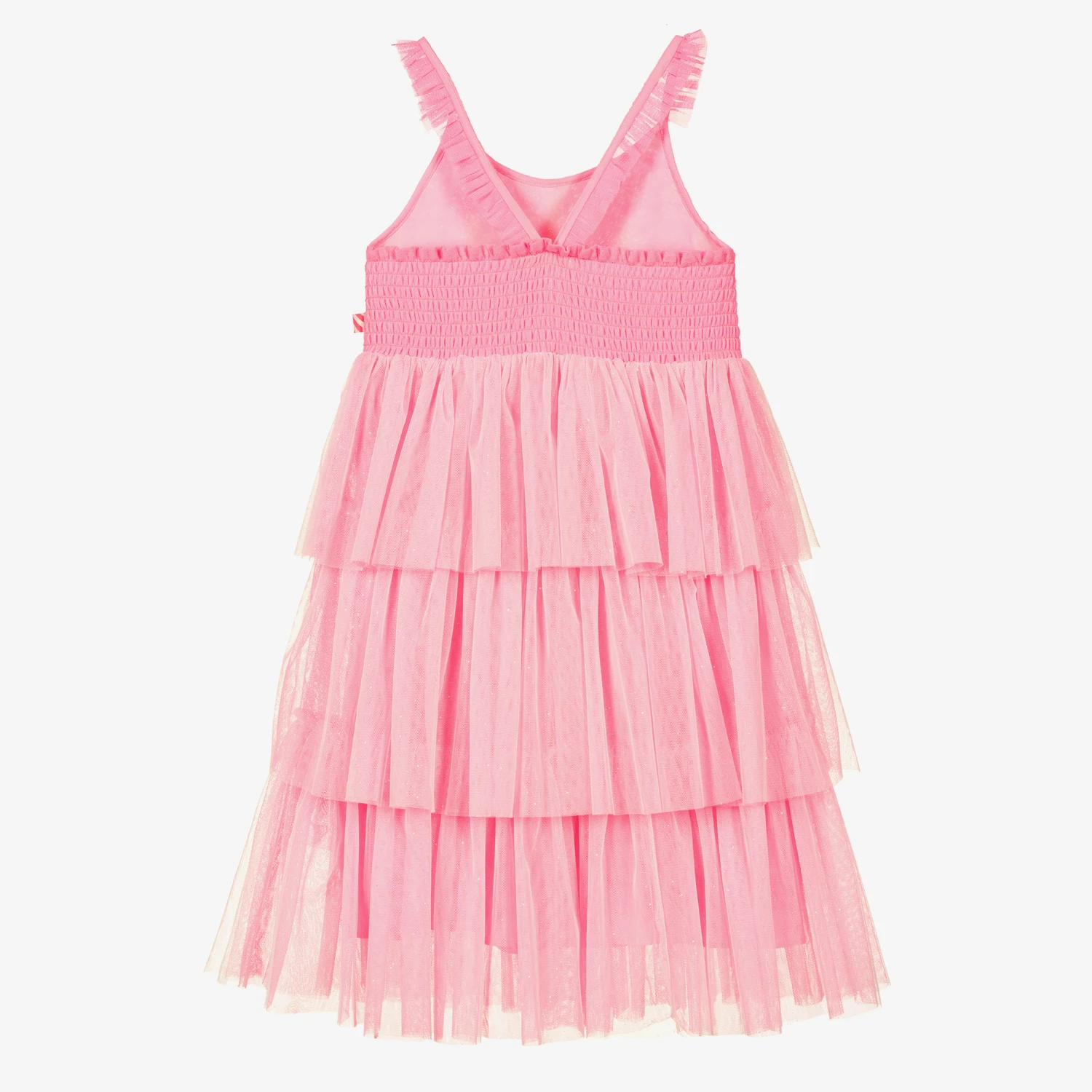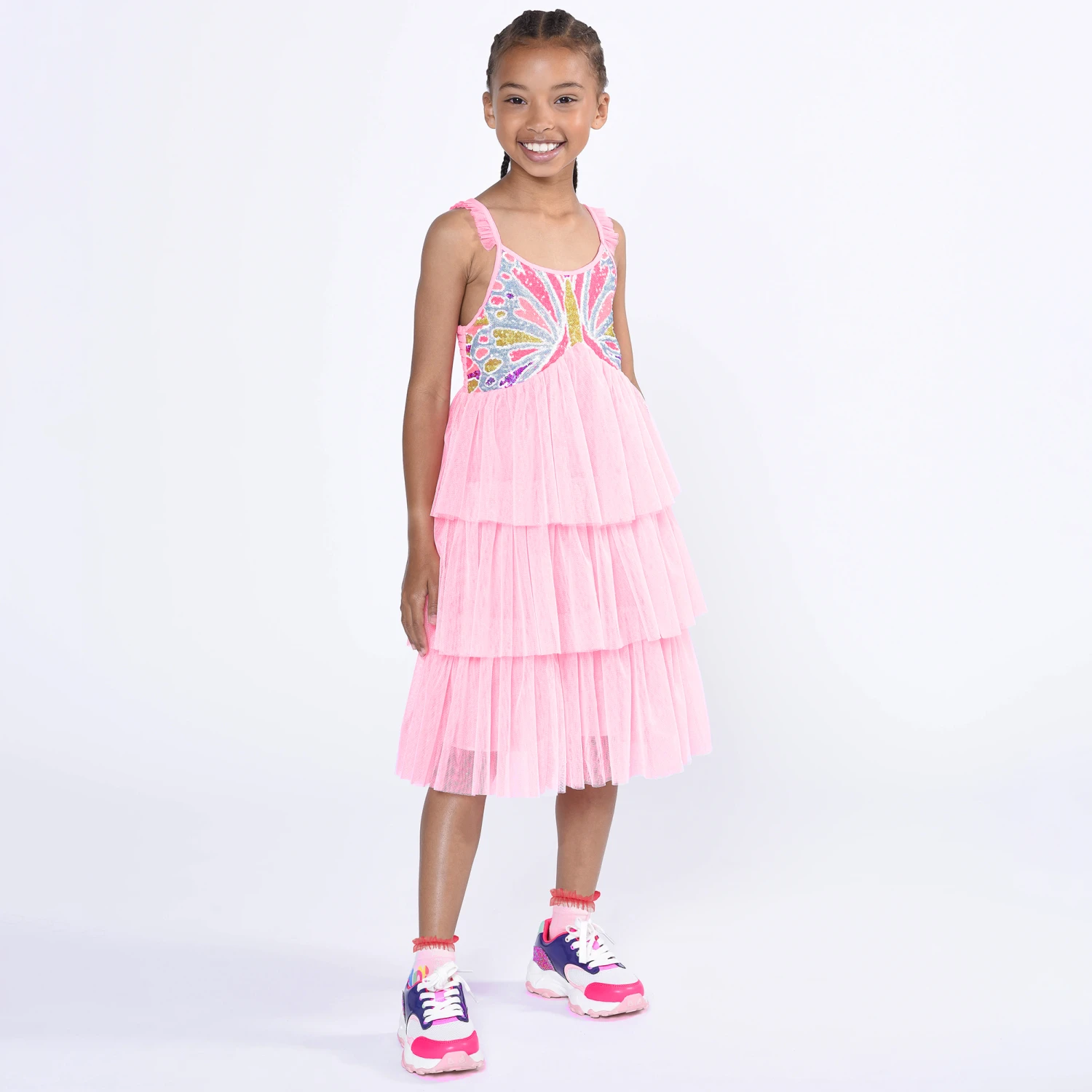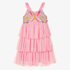 Eye-catching dress for girls by Billieblush, made in glittery pink tiers of bright pink tulle, with a shimmering sequinned butterfly bodice. Fully lined for comfort, it has frilled shoulder straps and a shirred back for a good fit. Easy to wear, it simply slips on over the head.