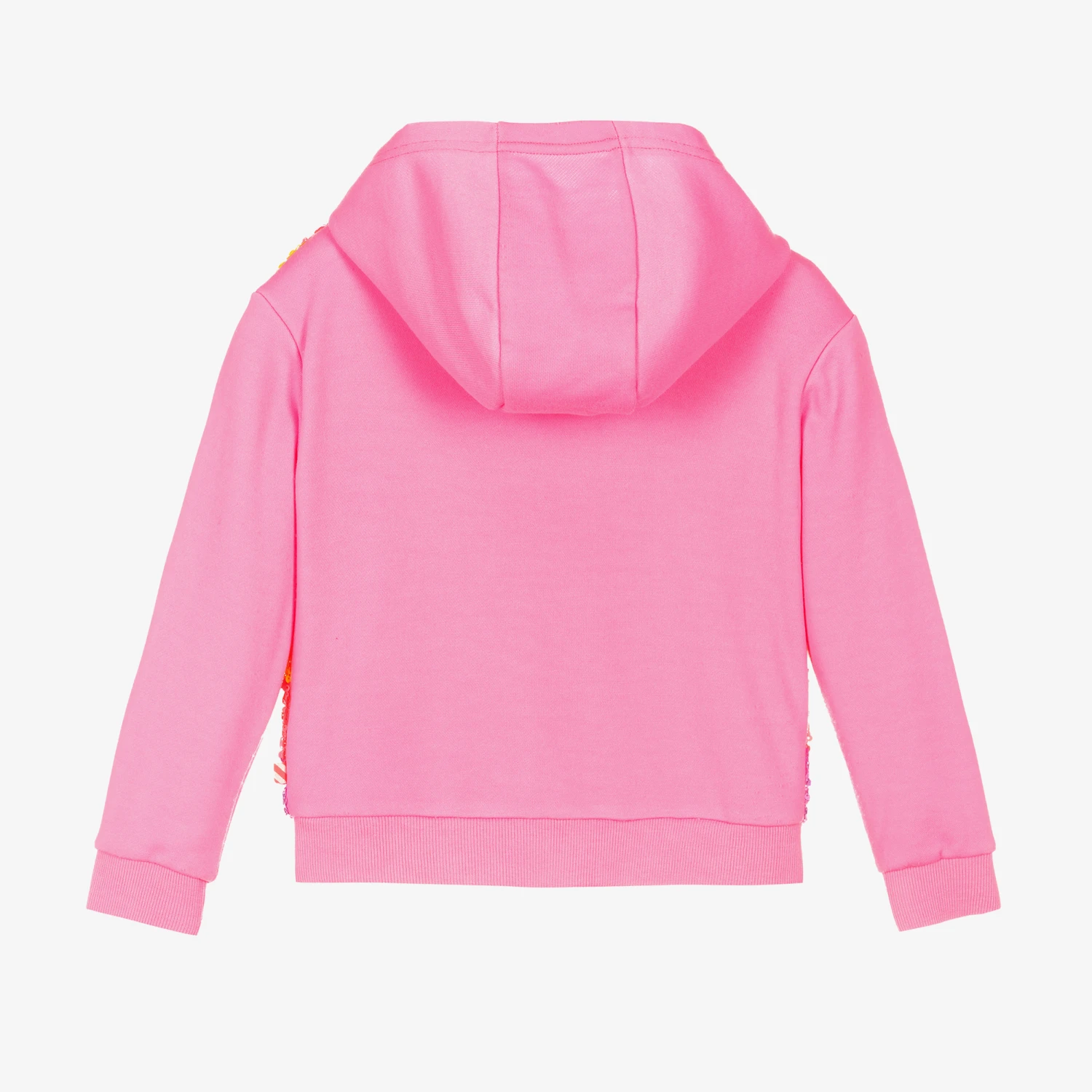 Vibrant pink, hooded zip-up top for girls by Billieblush, with gorgeous sequins on the front in shimmering shades of pink, purple, orange and yellow. Made in stretchy, comfortable cotton jersey, it has cosy, elasticated pink trims and a front zip fastening with a gold pull tab.