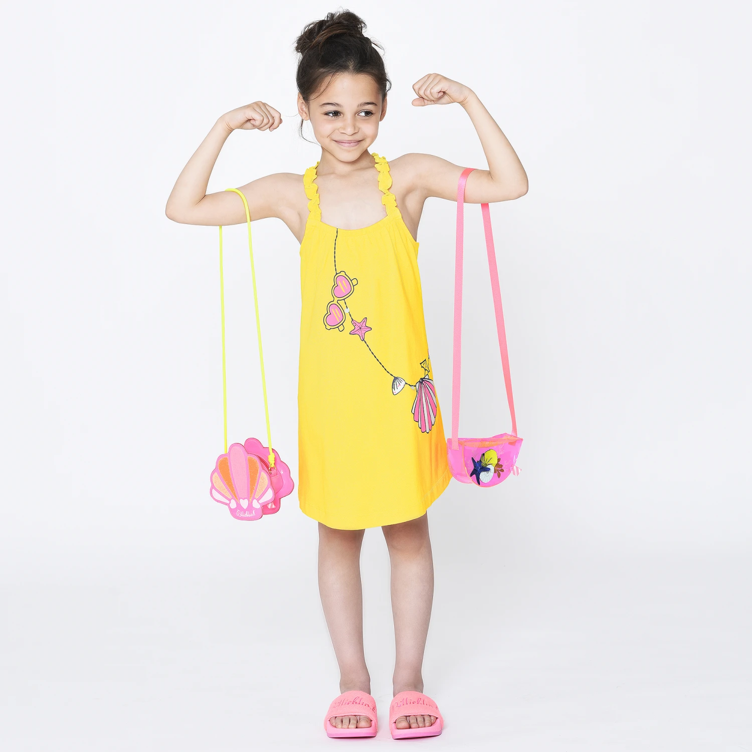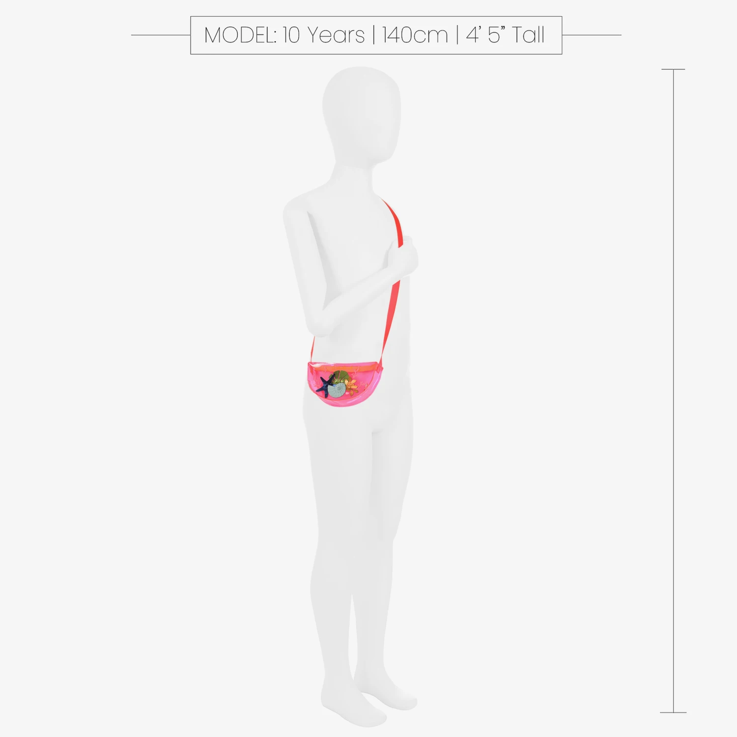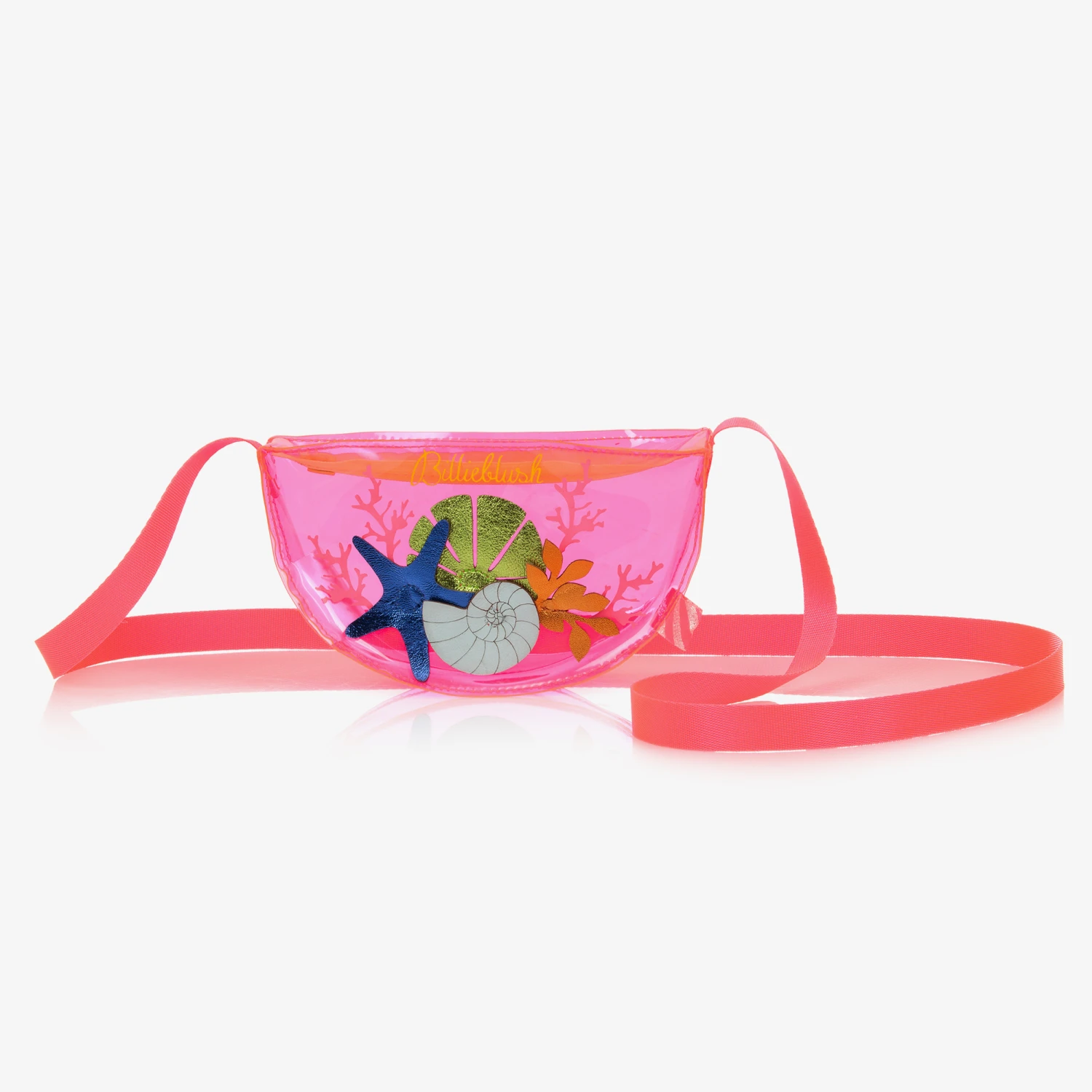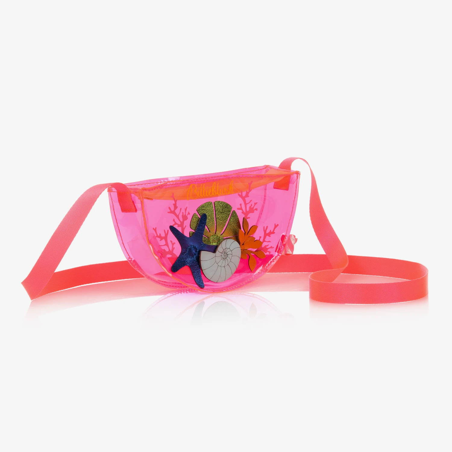 A pretty little neon pink shoulder bag by Billieblush. Made in transparent PVC, it has delicate sea themed shell appliquΓ©s in metallic blues, yellow and gold. There is a yellow zip fastening on the top and a pink ribbon shoulder strap.