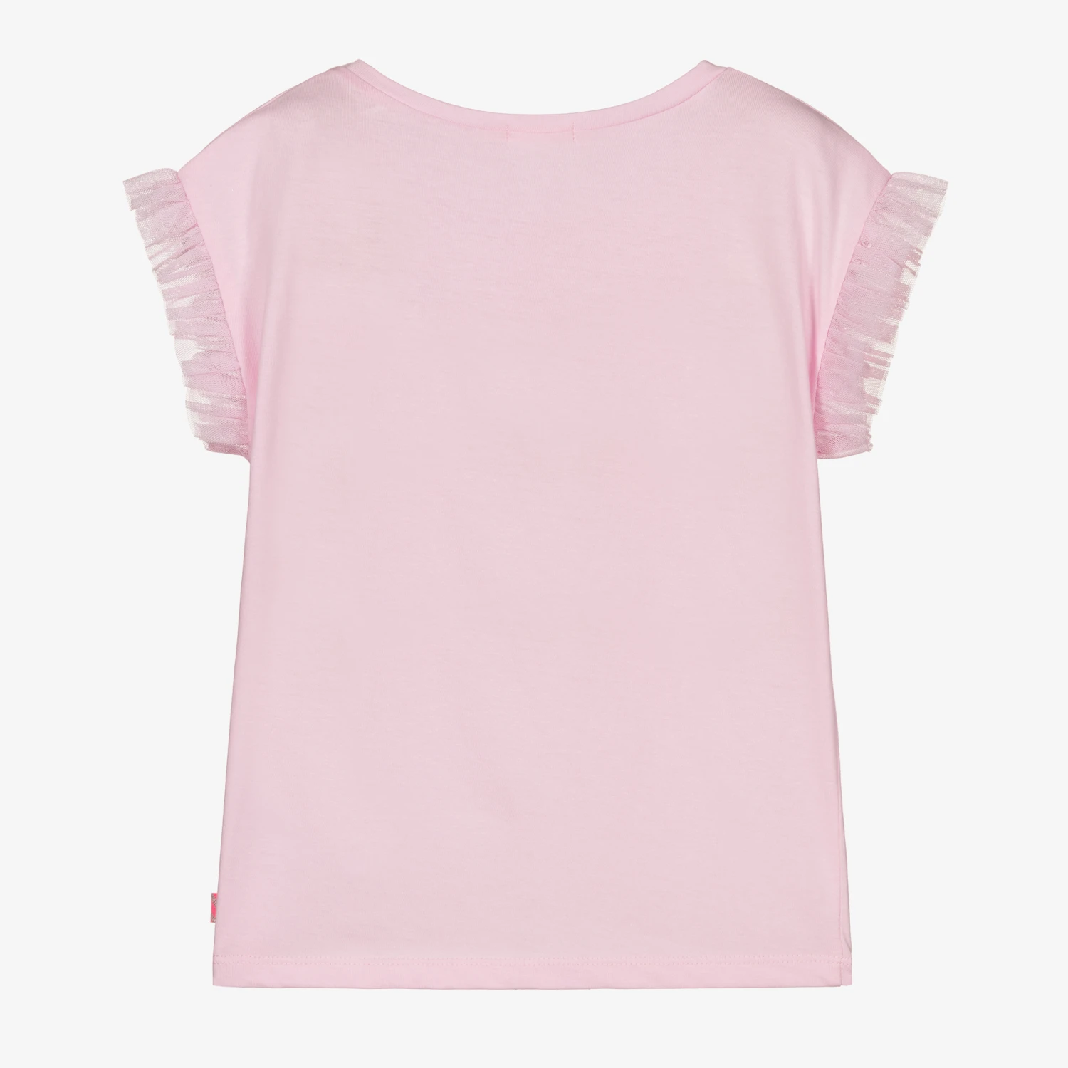 Pale pink T-shirt for girls, by Billieblush. Made from soft cotton jersey, it has a neon pink and orange glittery ‘Best Friends Forever’ slogan print on the front, with a pale pink ruffle tulle sleeves.