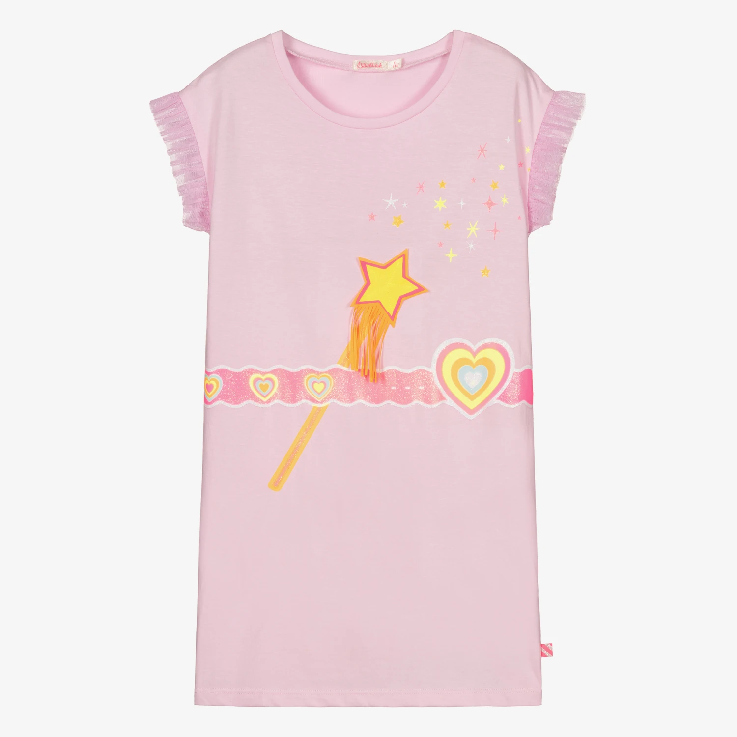 Pale pink cotton dress for girls by Billieblush. Made with soft and stretchy jersey, it has a fun magic wand design, with glittering hearts and stars prints in vibrant neon colours. There are pretty tulle short sleeves and a striped logo tab on the side seam.
