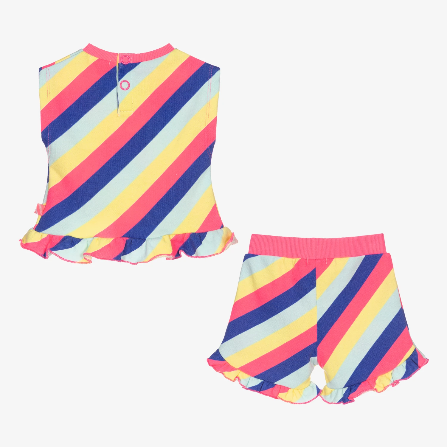 Casual neon pink striped shorts set for little girls, by Billieblush. Made in soft cotton sweatshirt jersey, this fun co-ord has a blue, yellow and neon pink striped pattern all-over, neon pink ribbed trims, and ruffle trimmed hems.