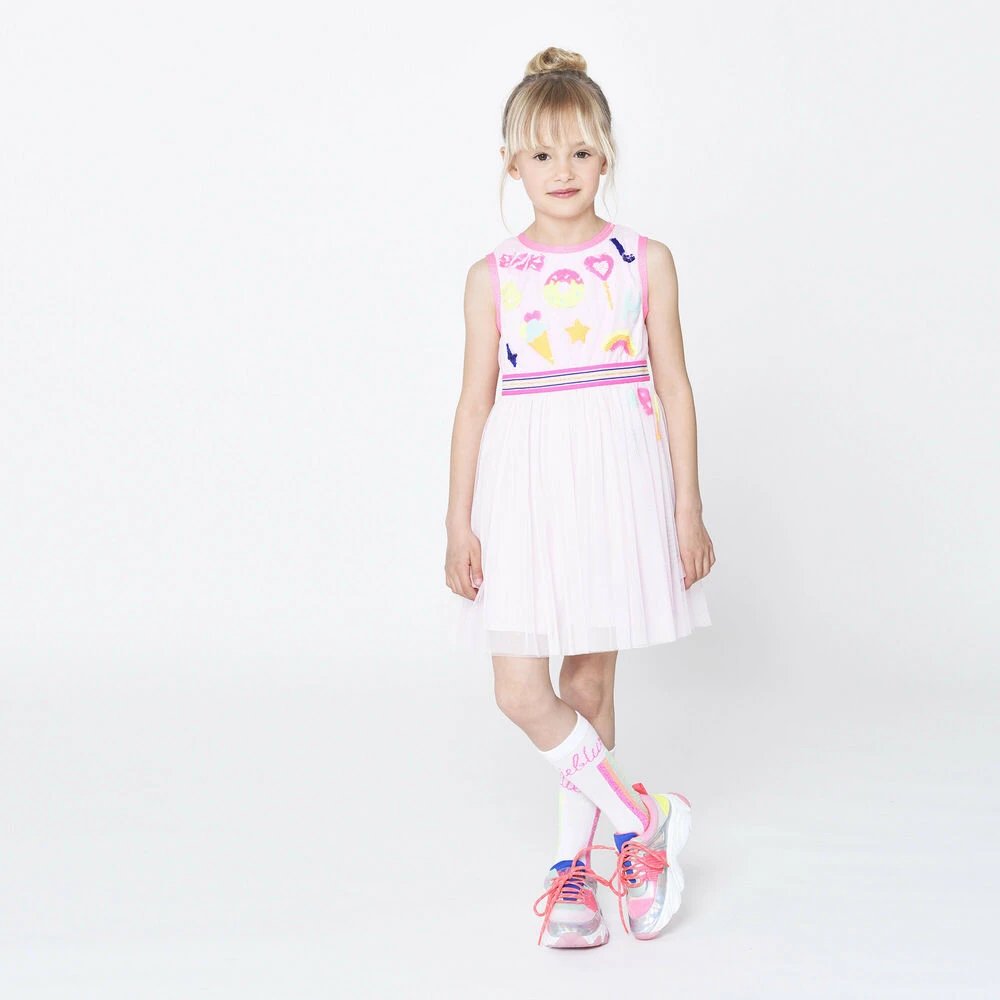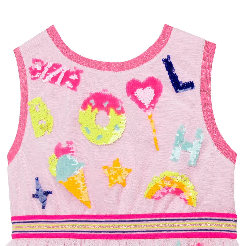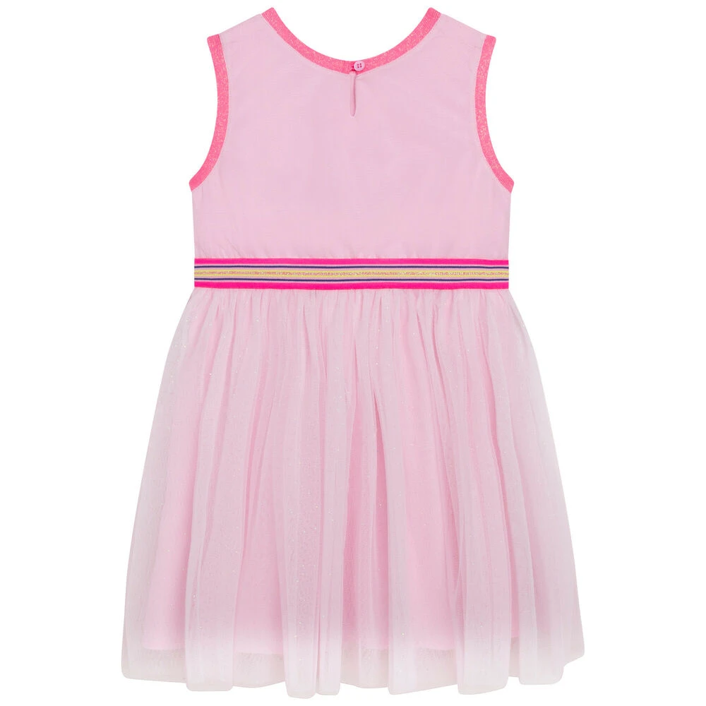 Pretty pink dress for girls by Billieblush. This tulle dress is fully lined in soft silky viscose and is decorated with sequins and a colourful striped waistband. Fastens with a button at the back.