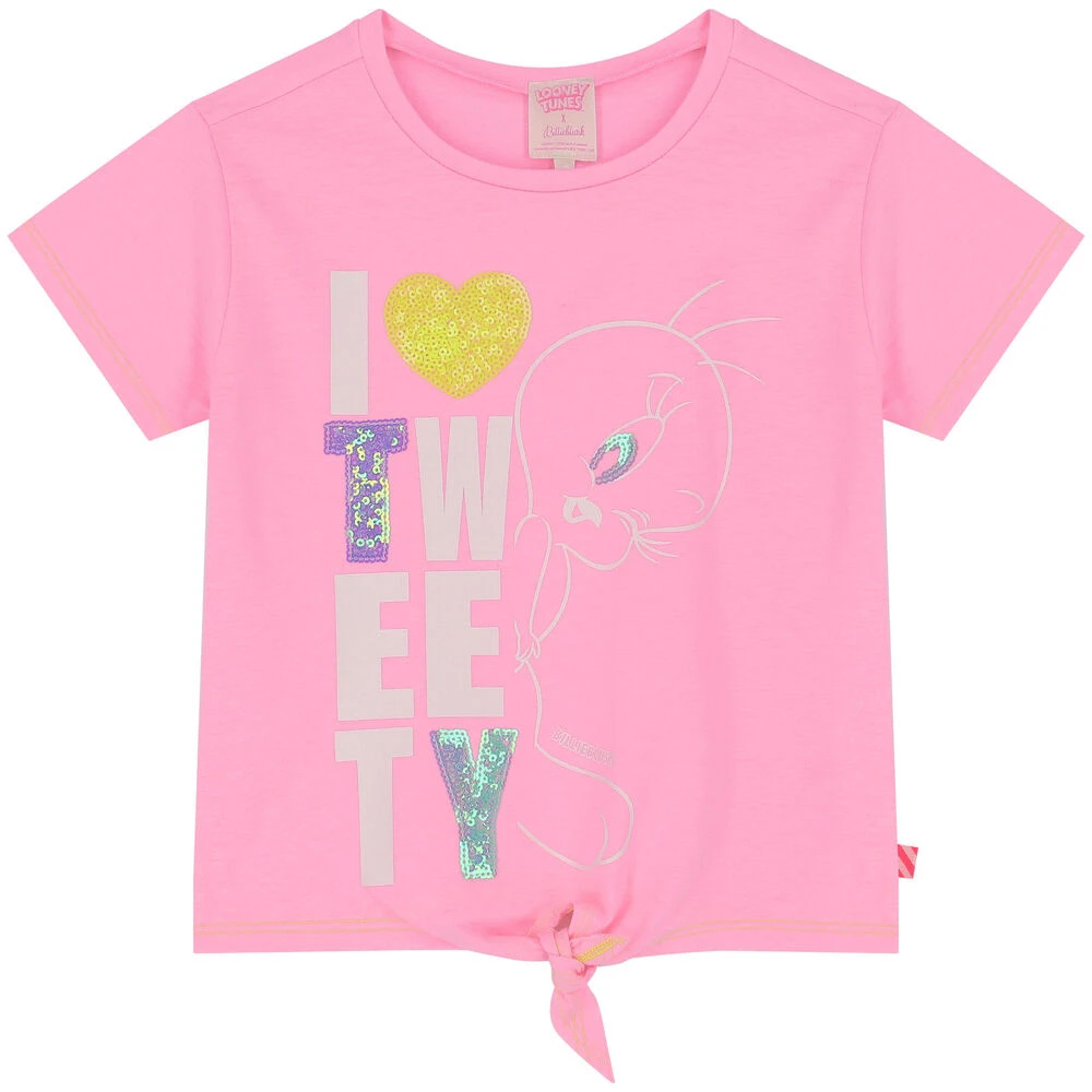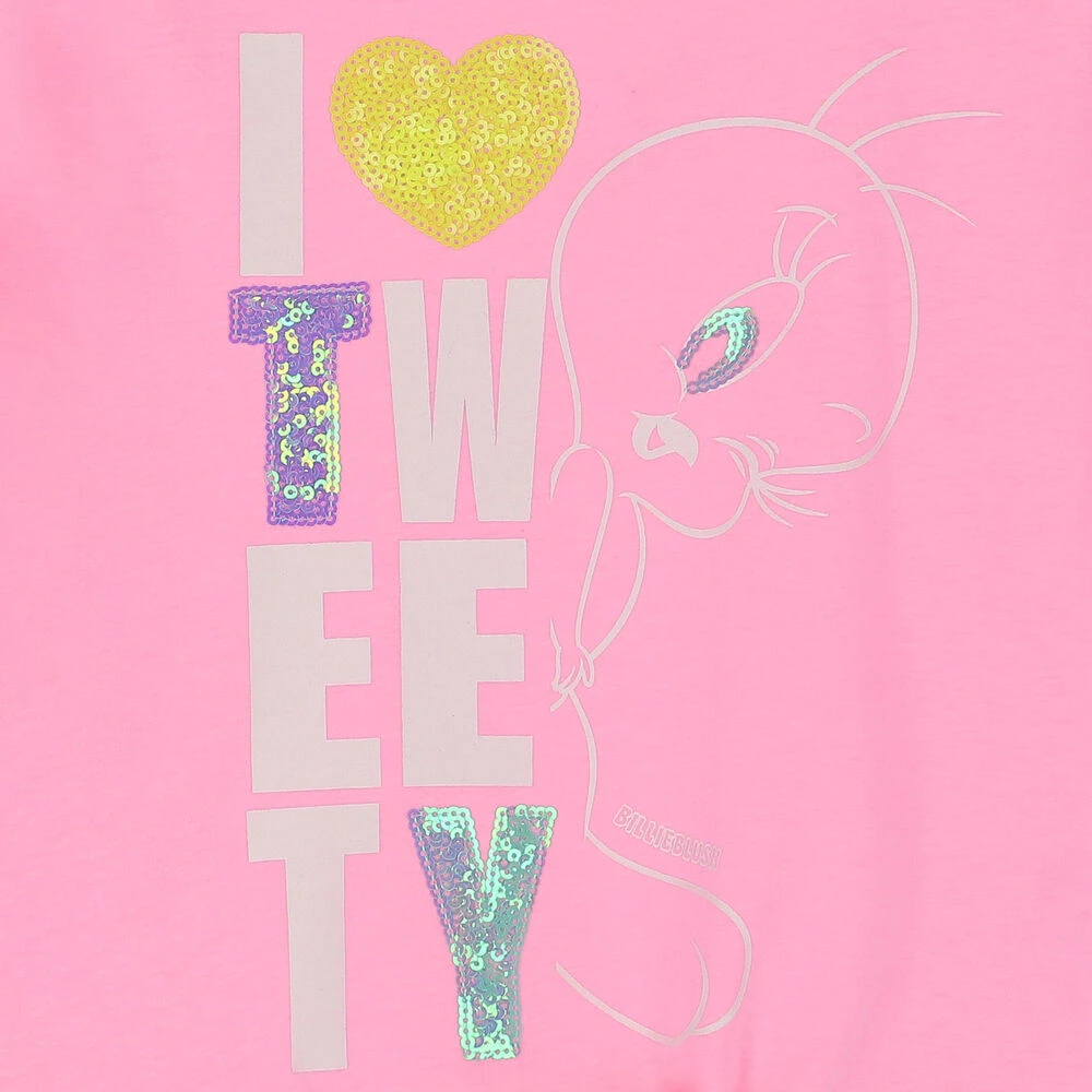 Pink t-shirt for girls by BILLIEBLUSH. Made from soft jersey, it has a tweety bird print in white and slogan with embellished sequins on the front.