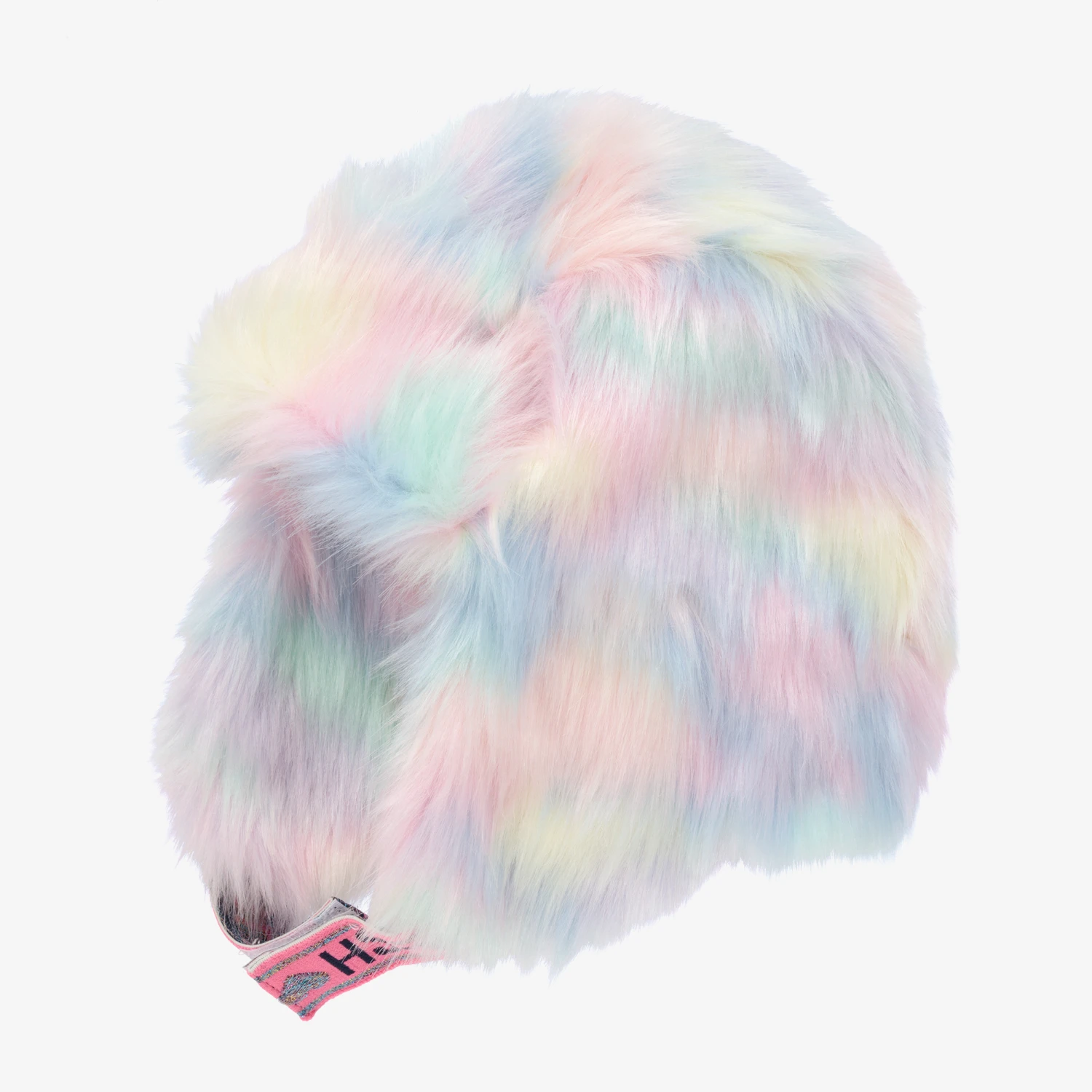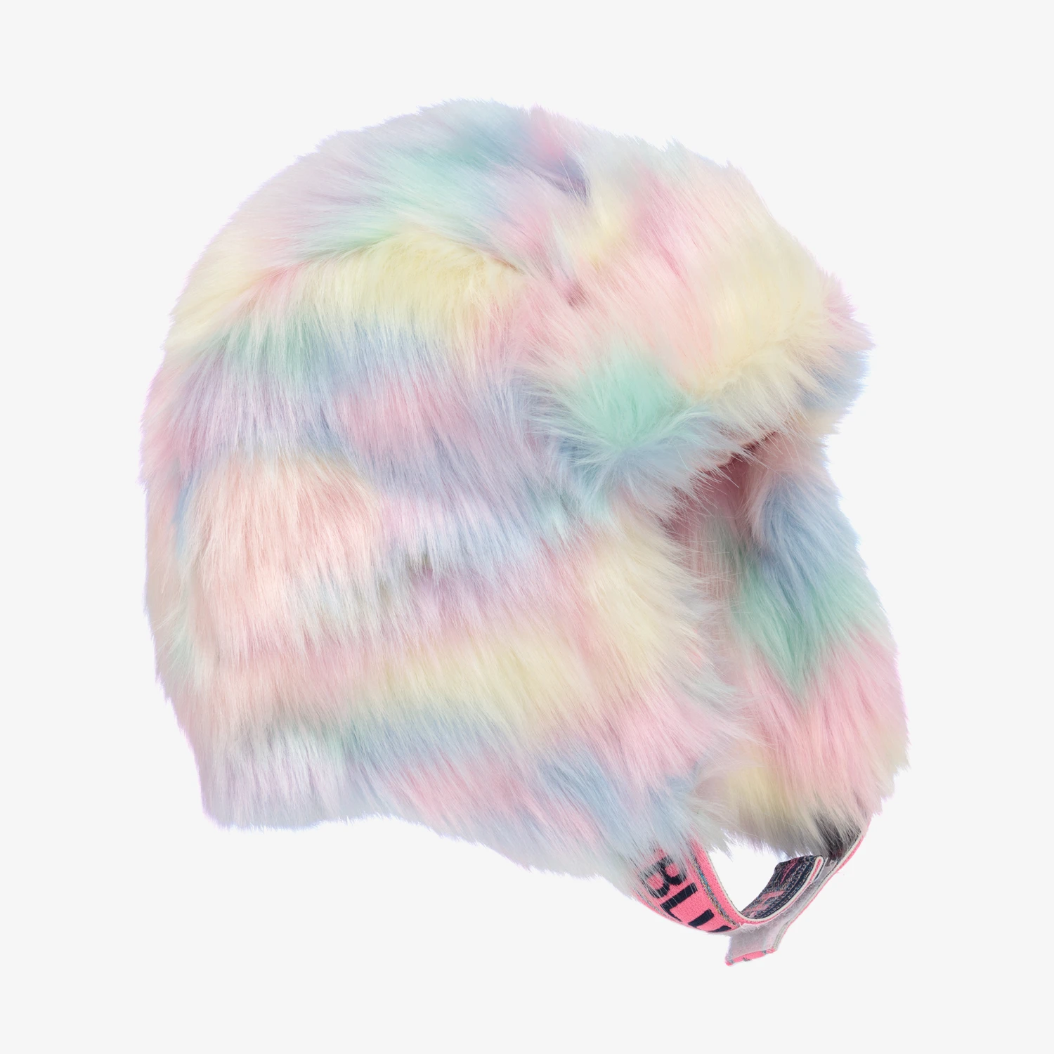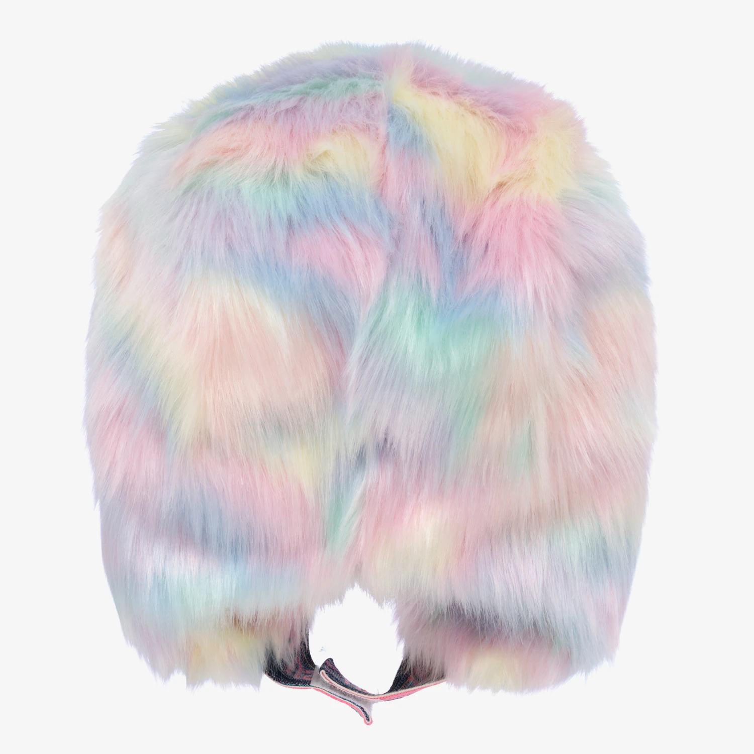Pastel rainbow hat for girls by Billieblush, made in soft faux fur. It covers the ears and fastens under the chin with velcro-fastening logo tape straps. It has a silky pale pink satin lining.