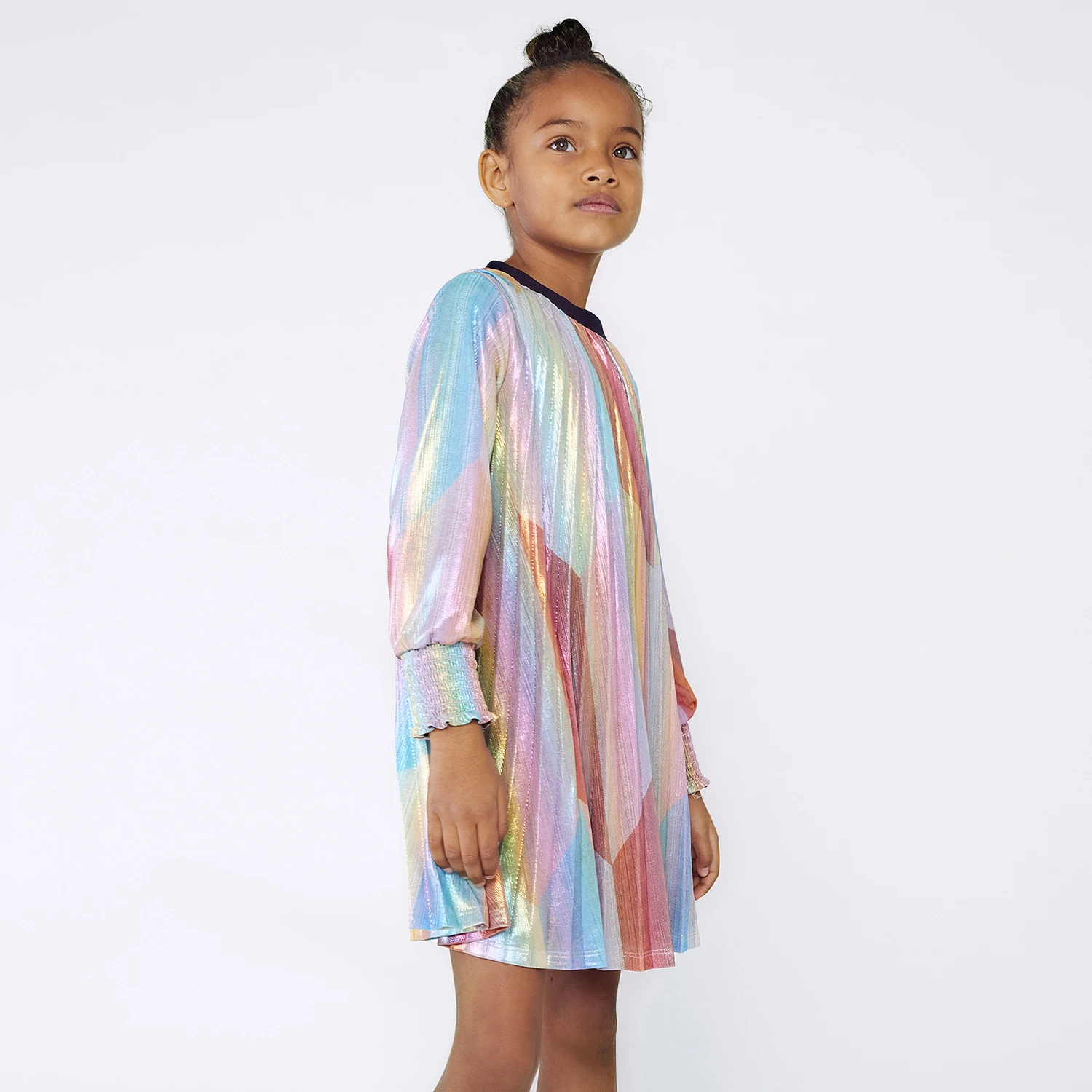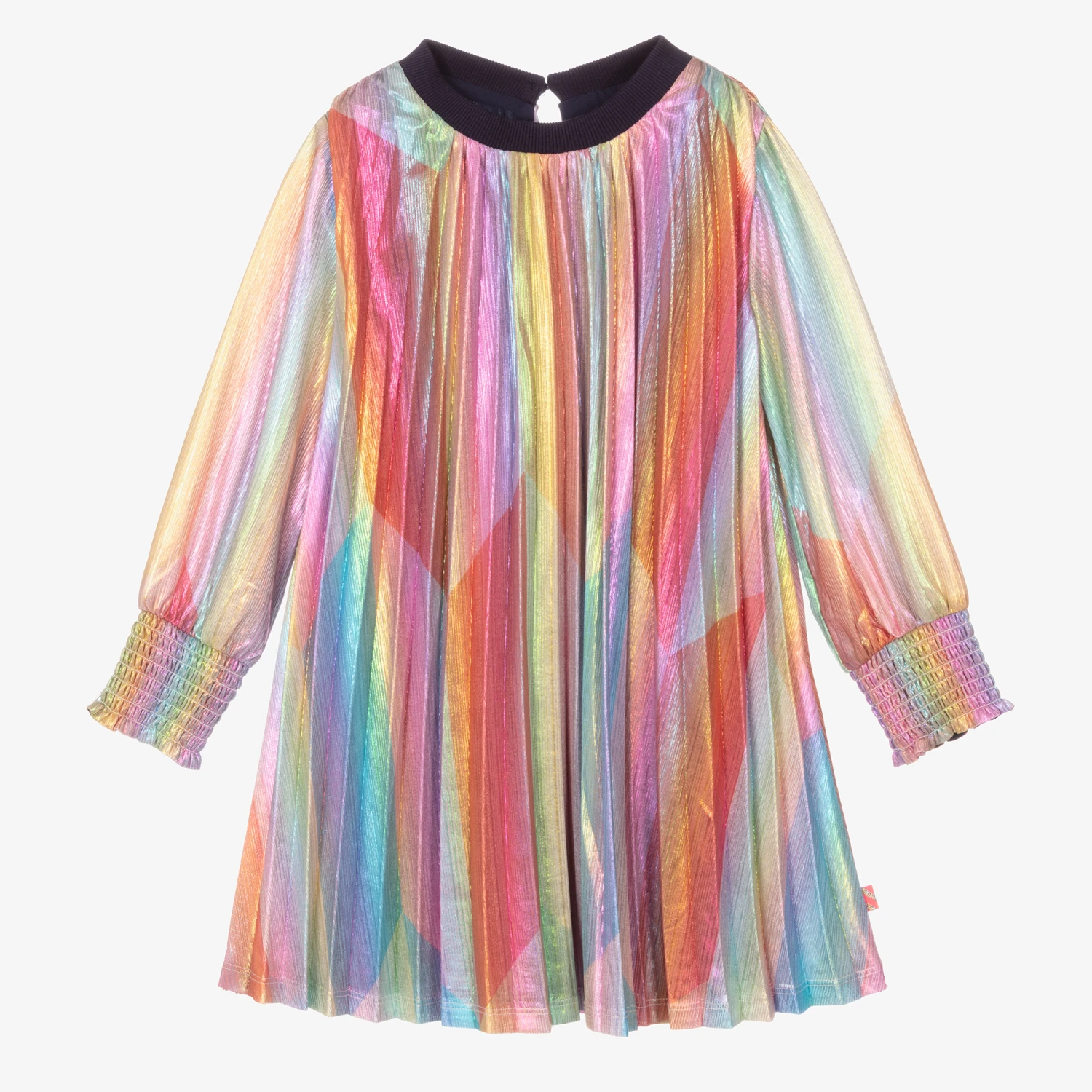 Girls will stand-out in this striking rainbow pleated dress by Billieblush. Fun and colourful, this trapeze dress is made in soft and stretchy lurex with shimmering threads. It has a comfortable, lightweight viscose lining, a ribbed cotton crew neckline in navy blue for a casual look and stretchy shirred cuffs.
