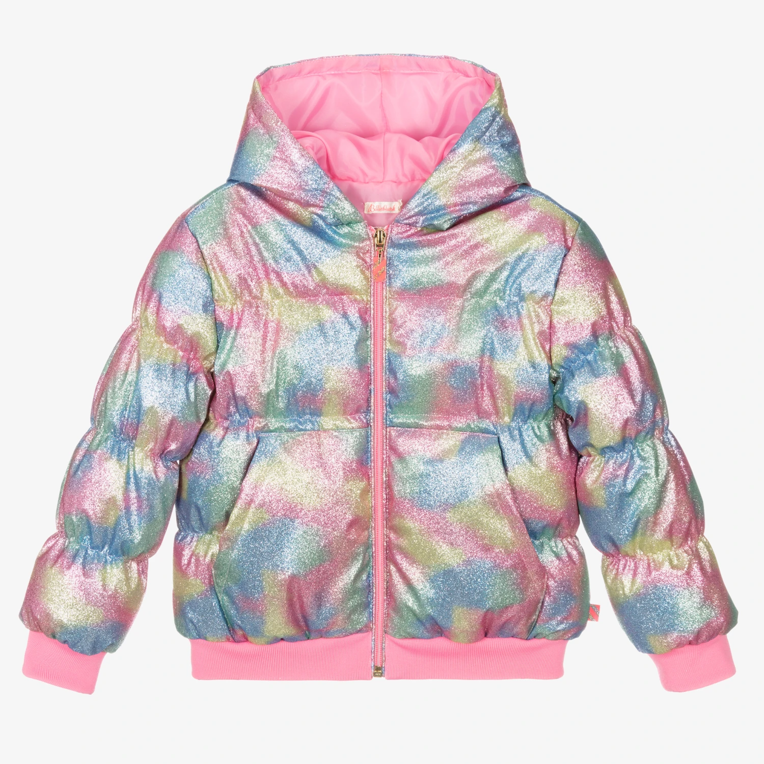 Rainbow puffer jacket for girls by Billieblush, made in glittery polyester. Warm and padded, it has fixed hood and a silky satin lining. There are front patch pockets and a front zip fastening with a logo pull tab and a logo tab on one side seam. It has pink ribbed cuffs and hem for extra cosiness.