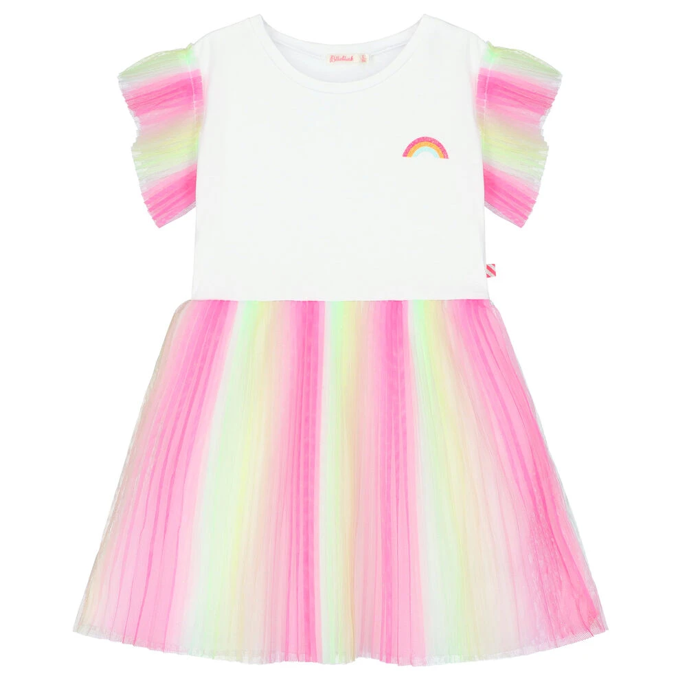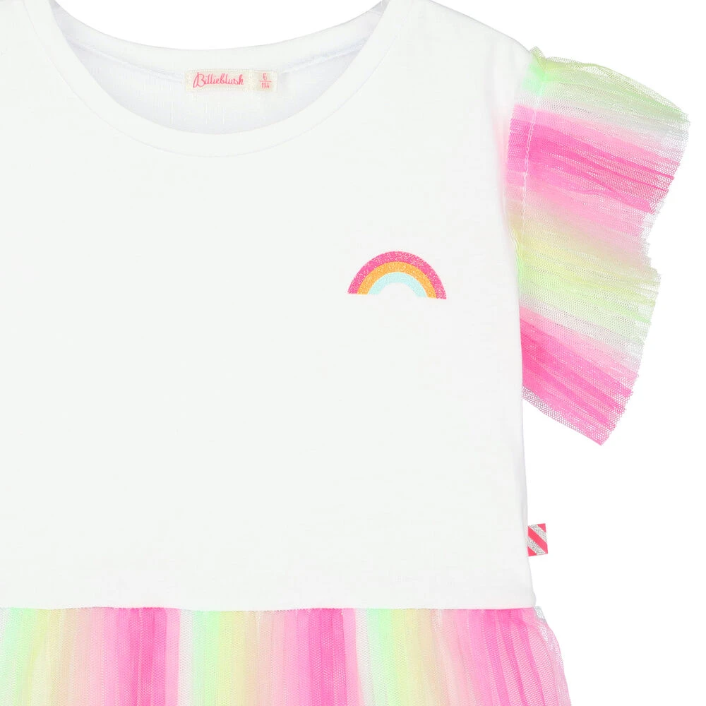 Pretty dress for girls by Billieblush. Features a white bodice made from soft cotton jersey with a rainbow print on the chest and rainbow tulle trims to the sleeves. The skirt is made of layers of soft pleated rainbow coloured tulle which is fully lined.