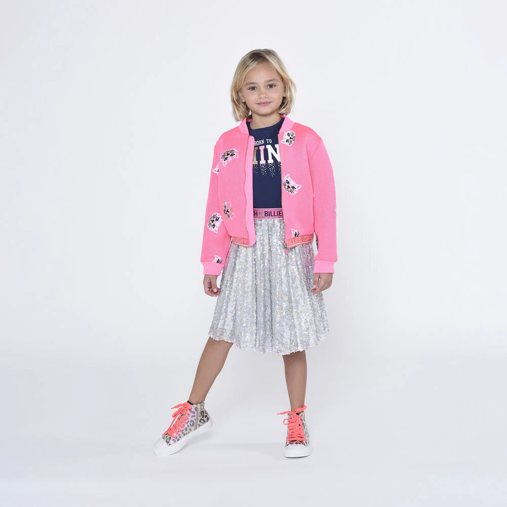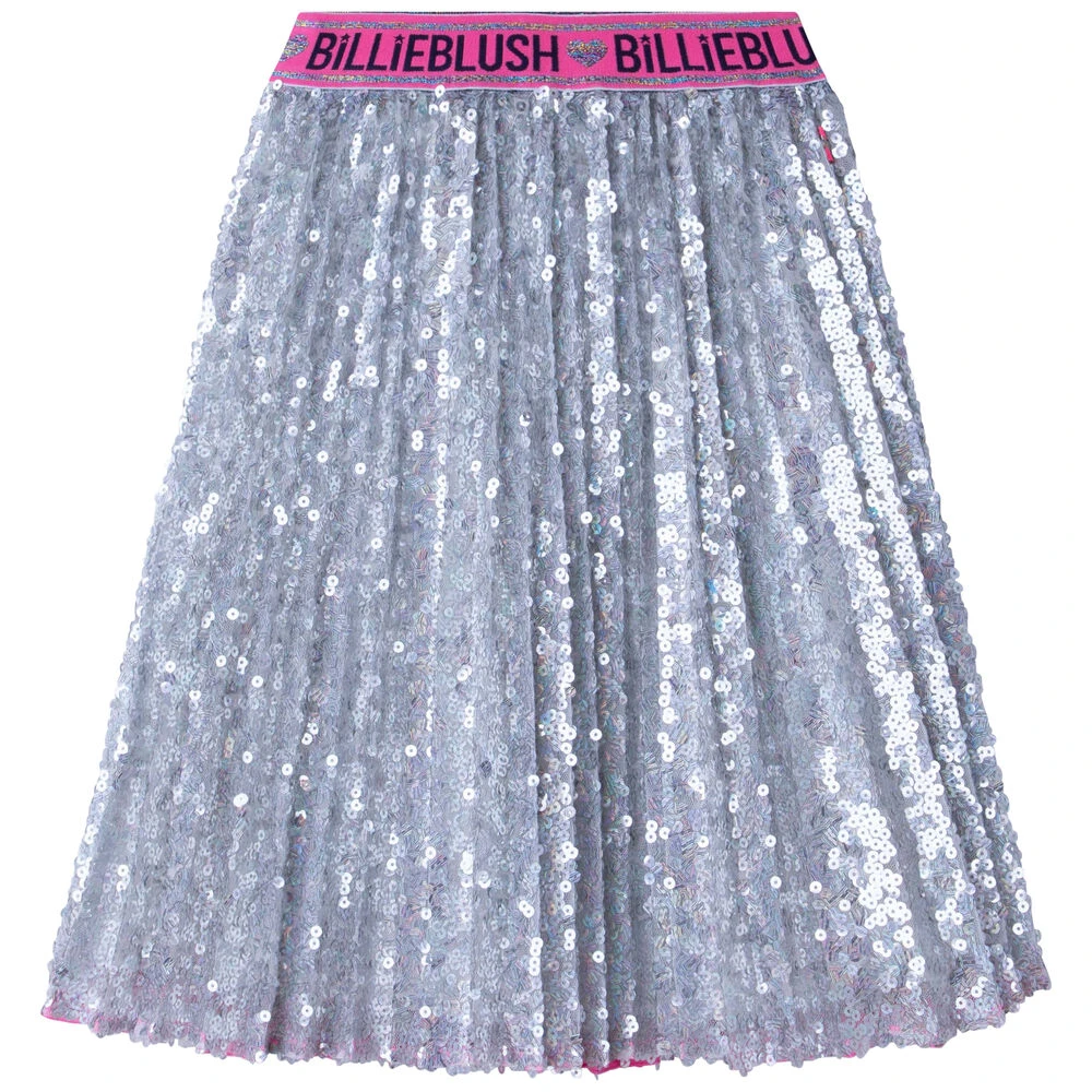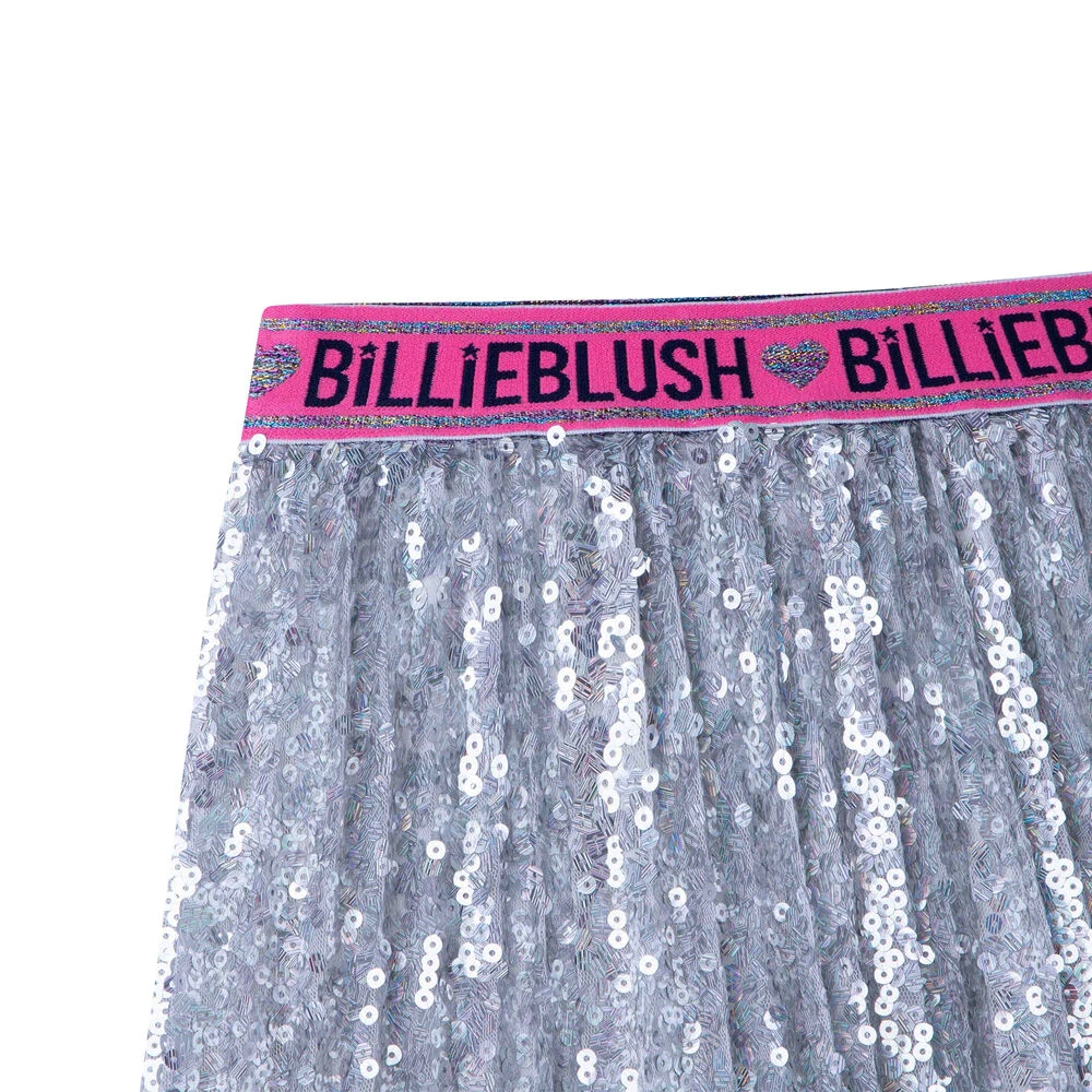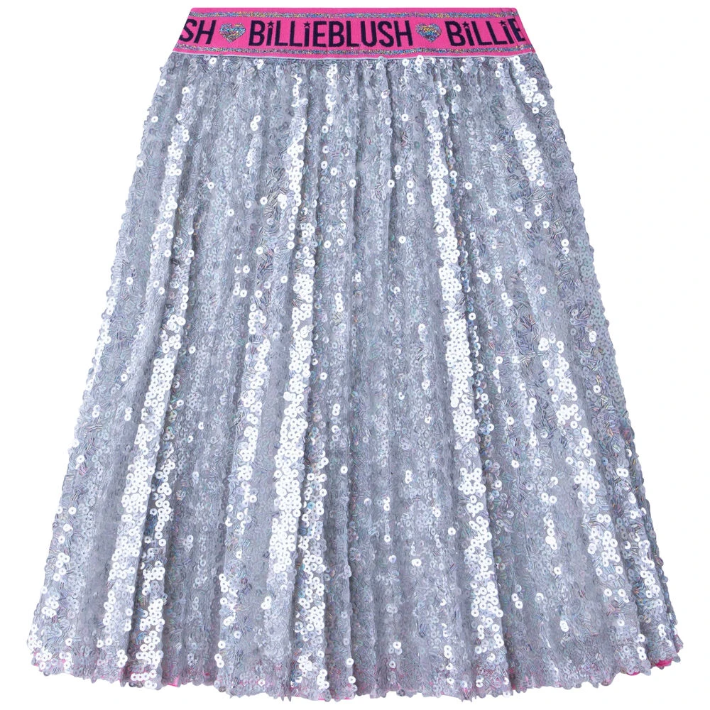 Silver sequin logo skirt for girls by Billieblush. Made from soft silky polyester, it features silver embellished and an pink elasticated waistband with the brands logo.