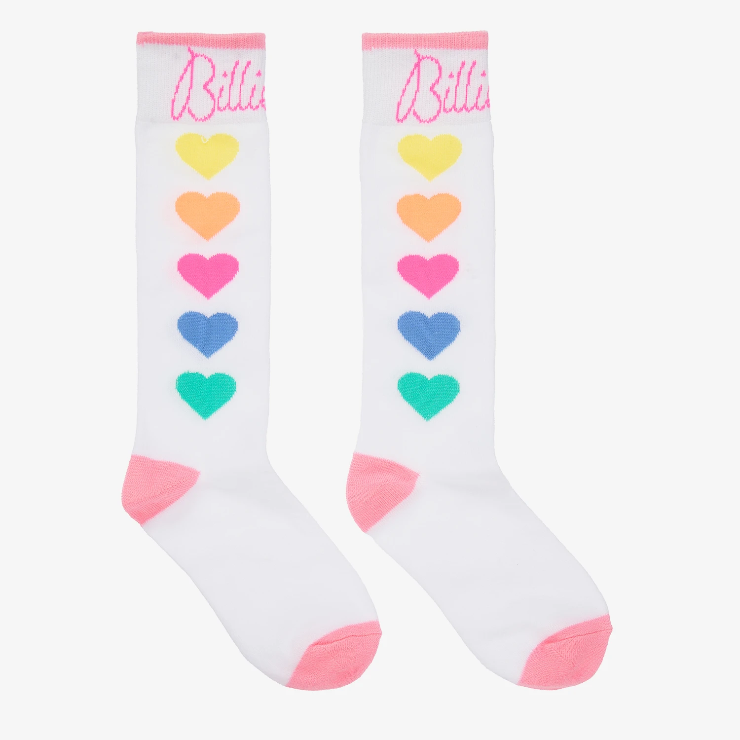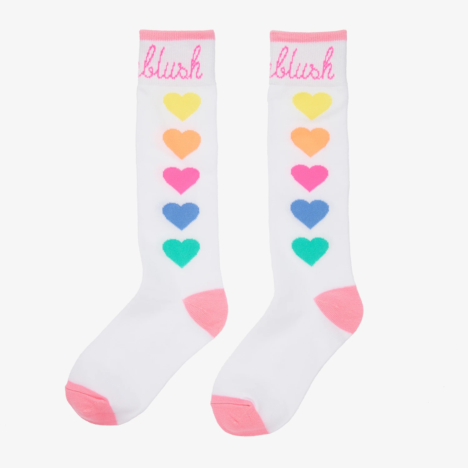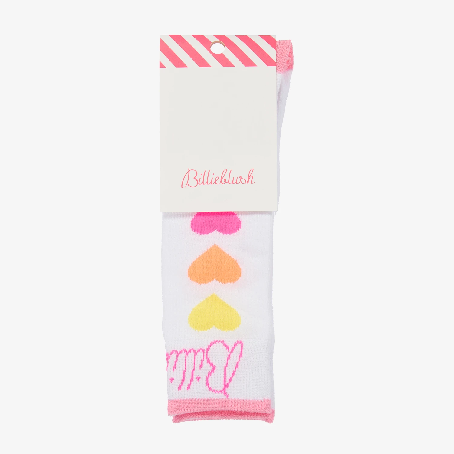 White long socks for girls by Billieblush, made in a comfortable cotton-rich blend. Soft and stretchy, they are patterned with colourful hearts on the sides and have pink trims and a neon pink logo around the ribbed cuffs.
