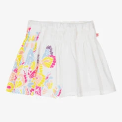 White cotton skirt for girls by Billieblush, with a colourful butterfly print shimmering in sequins. Lightweight and lined in voile, it is full and gathered, with a comfortable elasticated waist and ruched detailing below.