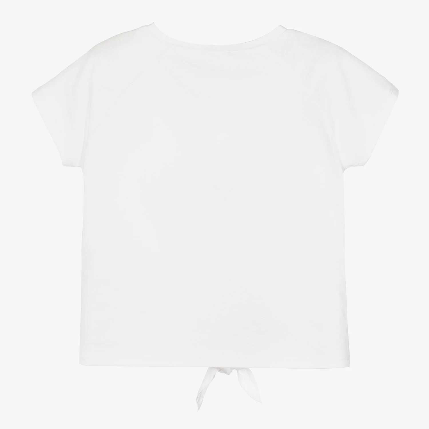 Eye-catching white T-shirt for girls by designer Billieblush, made in soft and comfortable cotton jersey. The epitome of creativity and imagination, it has a spray paint dog printed on the front, wearing sparkly sequined sunglasses. This top has a relaxed tie front and the brand’s signature striped logo tab on the side.