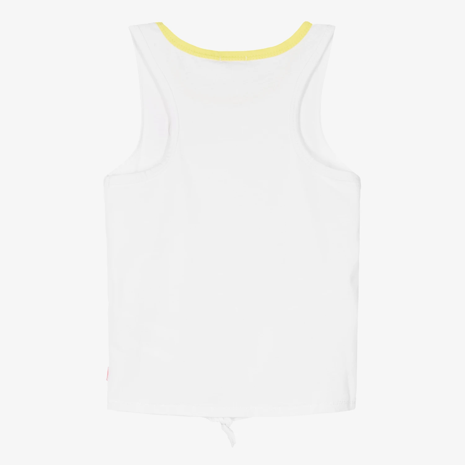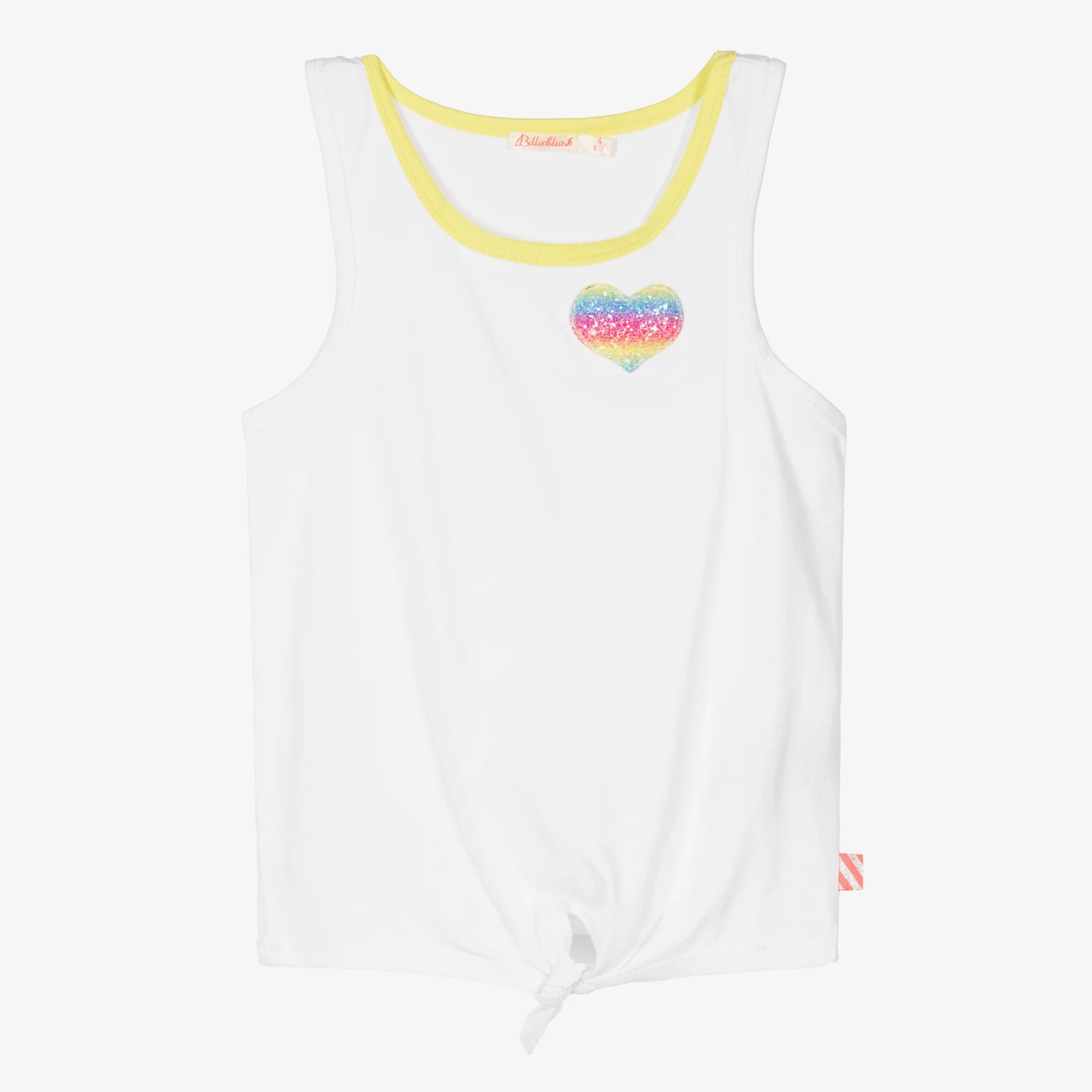 White vest top for girls by Billieblush. Made with soft and stretchy cotton jersey, it has a neon yellow neckline, a tie detail on the hem, and a glittery padded heart in rainbow colours on the chest.