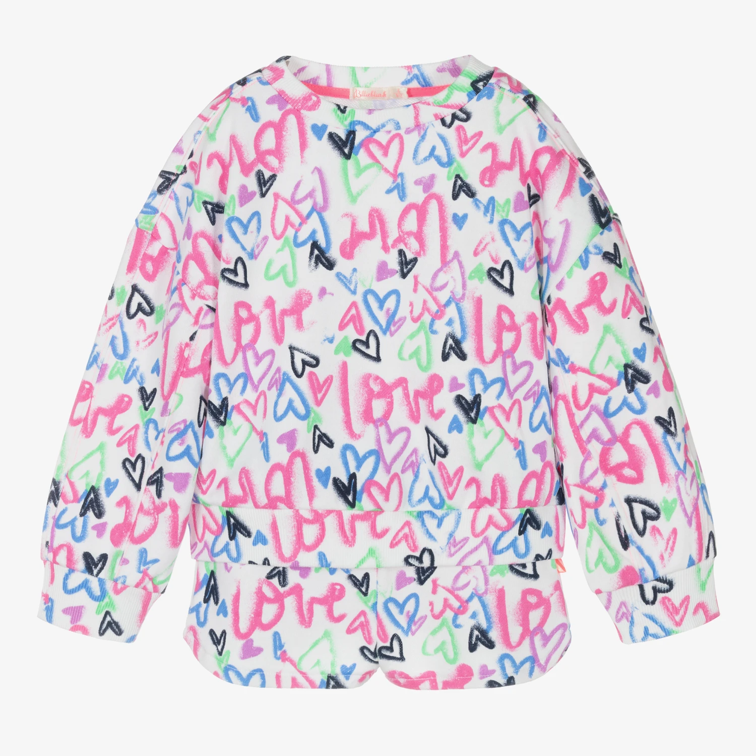 A fun white tracksuit for girls by Billieblush, with a colourful love heart graffiti print. Edgy and girly, this casual outfit is made in soft cotton jersey, with a breathable looped underside. The shorts have a stretchy ribbed waistband for comfortable, stylish wear.