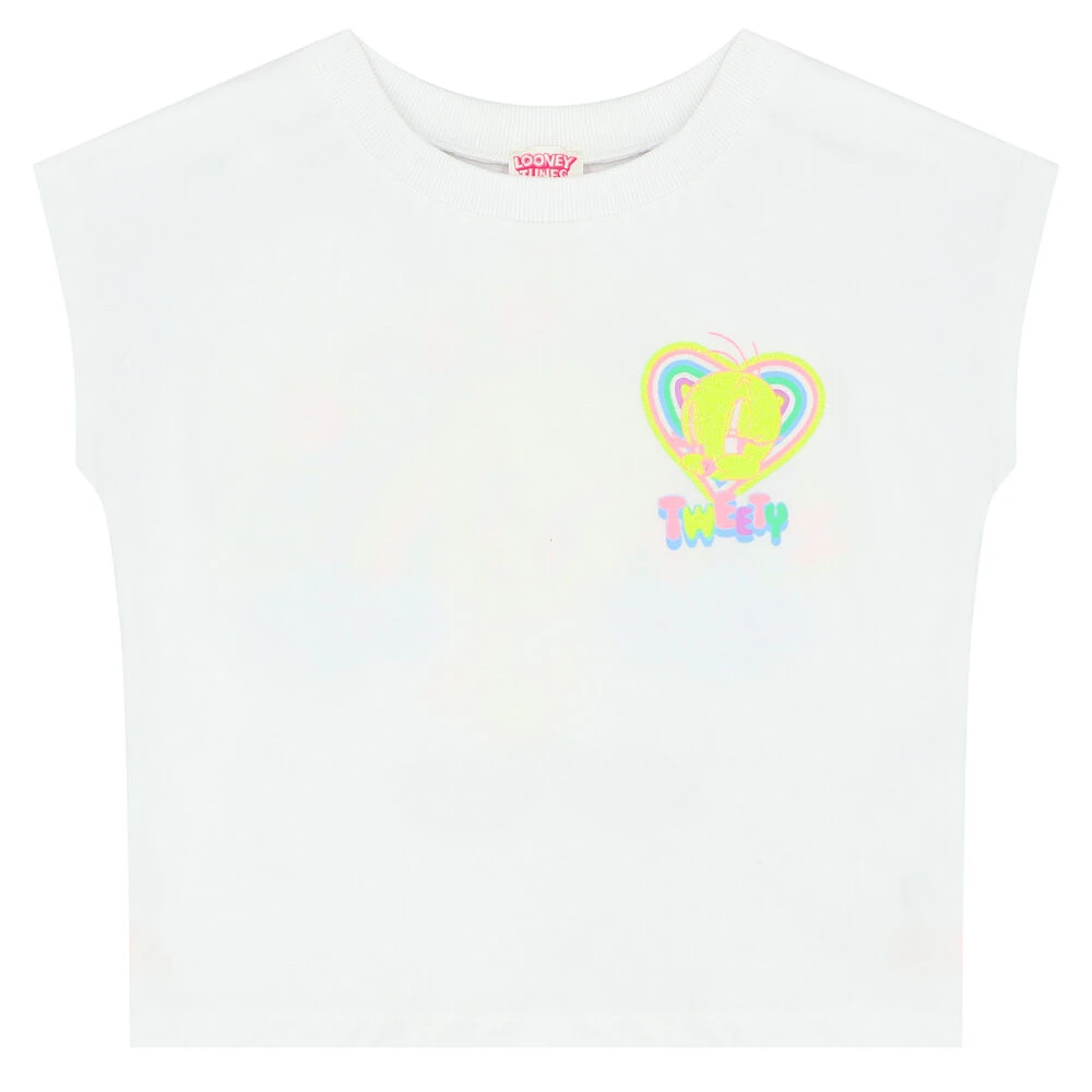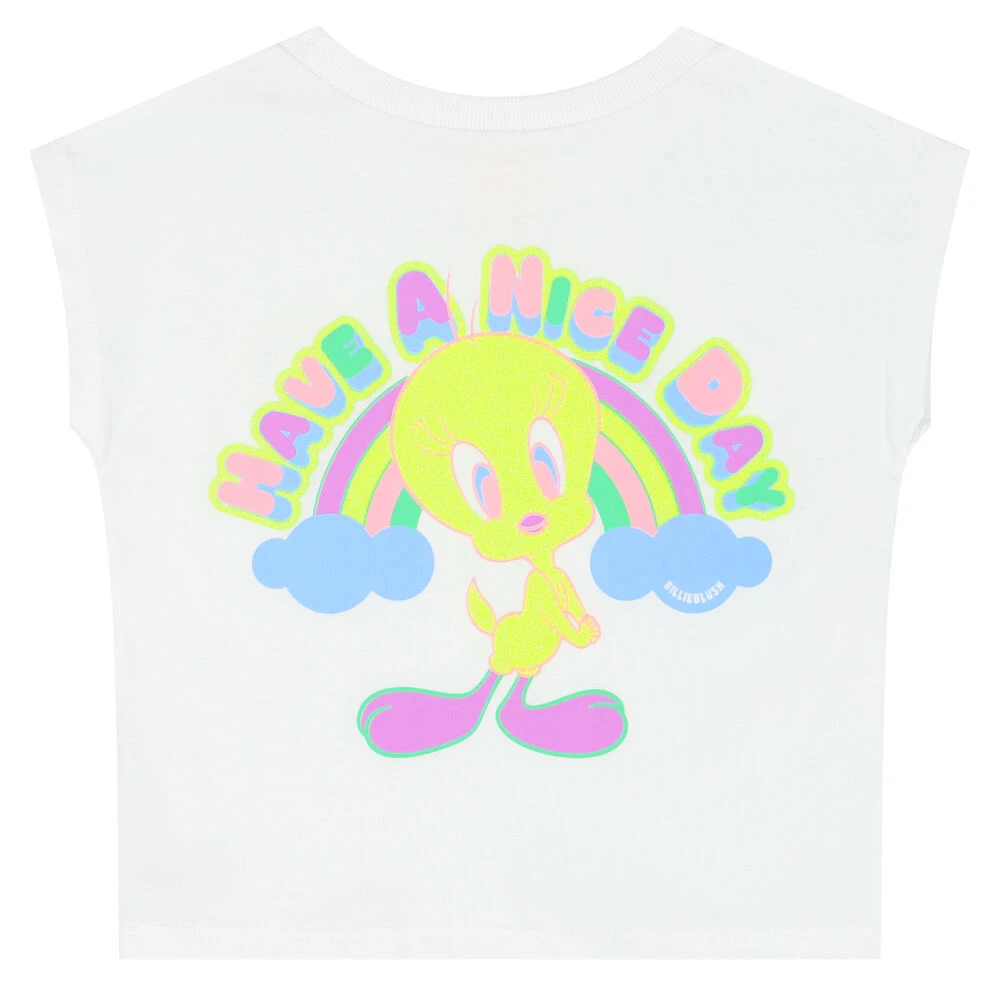 White t-shirt for girls by BILLIEBLUSH. Made from soft cotton jersey, it features a tweety bird print with yellow sparling glitters on the chest and at the back.