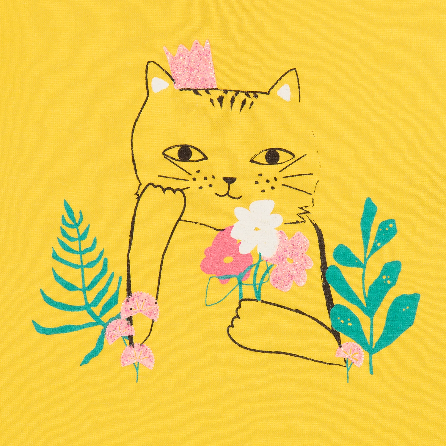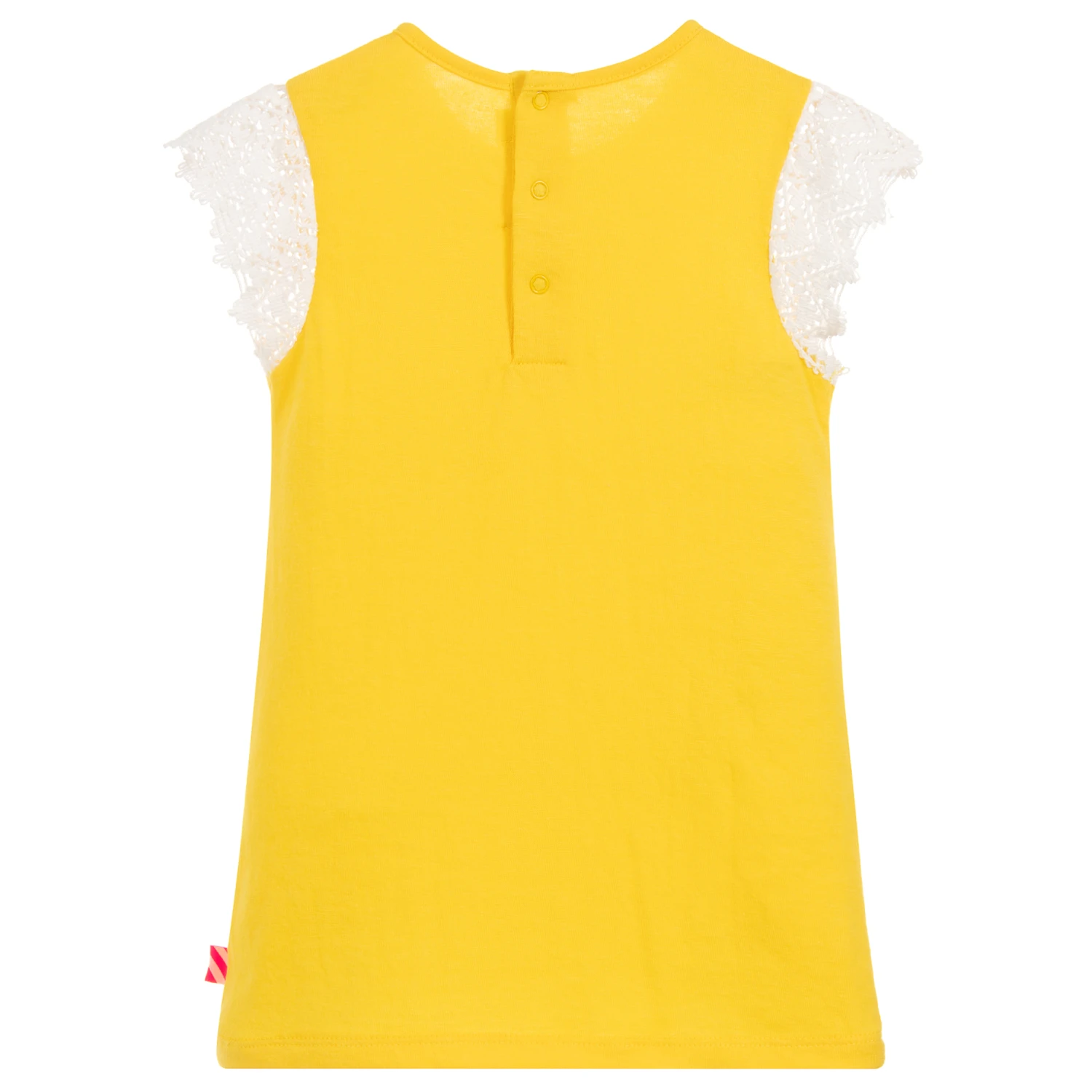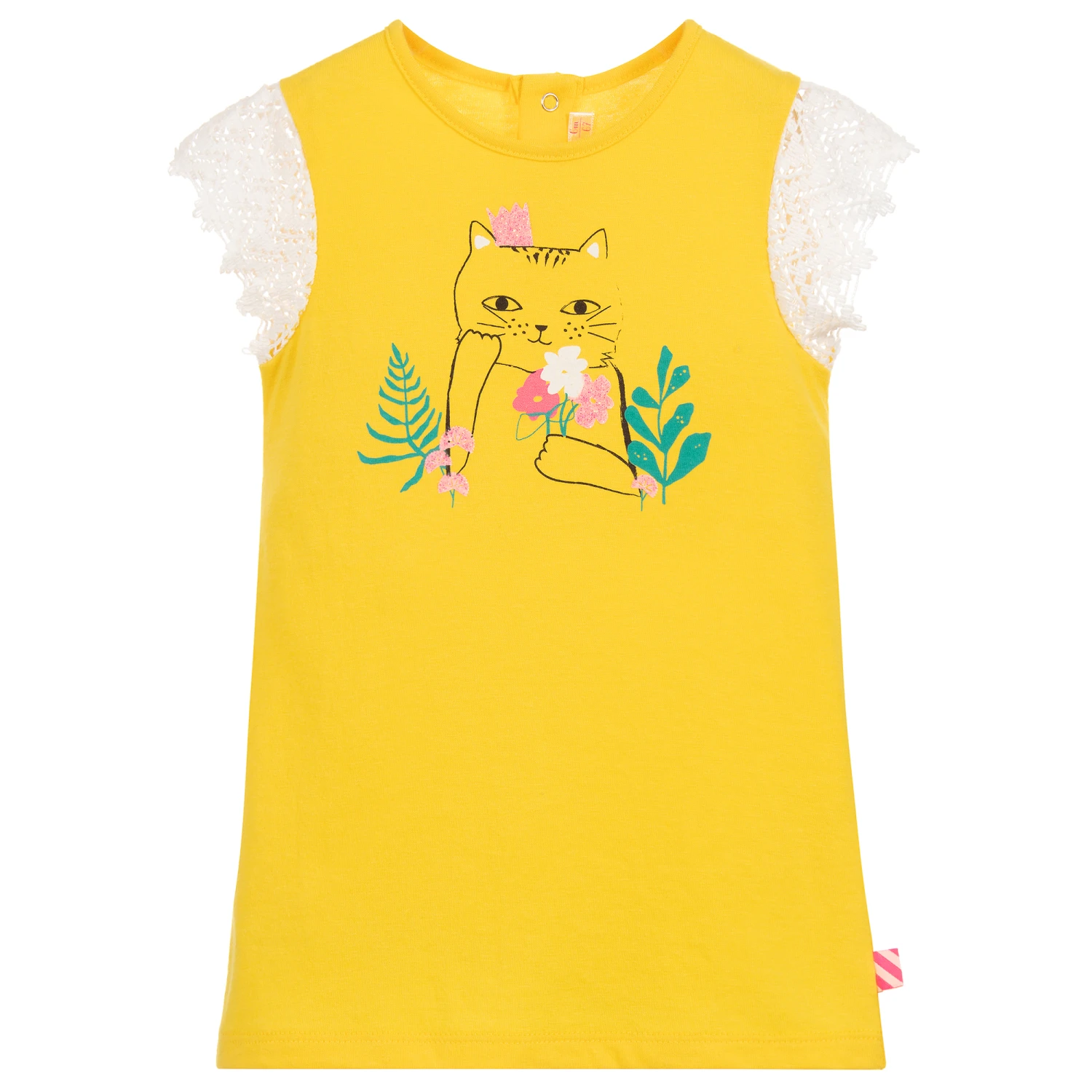 Younger girls yellow dress from Billieblush, made in a soft and stretchy polycotton jersey. It has a glittery cat print, with pretty lace sleeves and poppers on the back