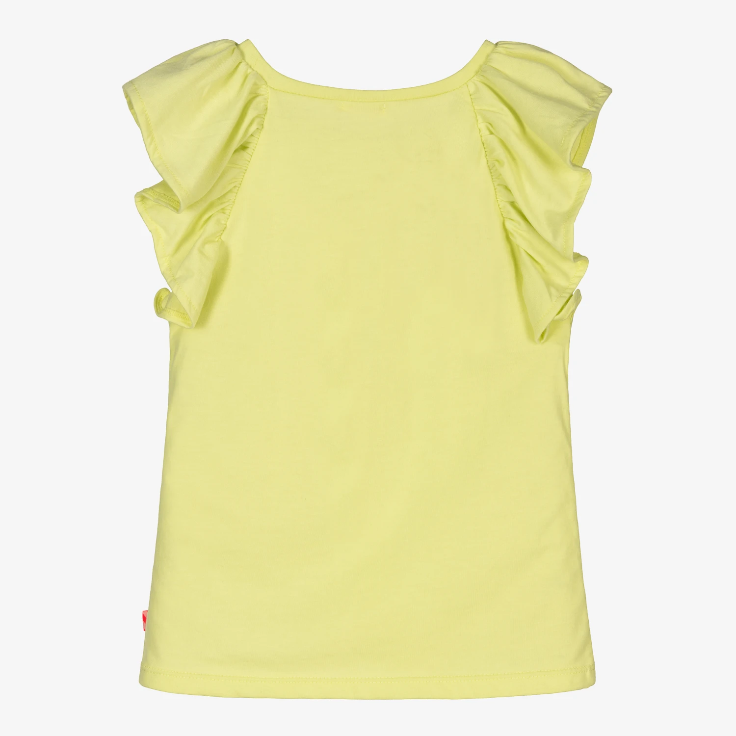 Pale neon yellow T-shirt for girls by Billieblush. Made from soft cotton jersey, it has a neon pink, orange and blue ice cream design in sequins and glitter prints. There are lovely capped sleeves with ruffles and a striped logo tab on the side seam.