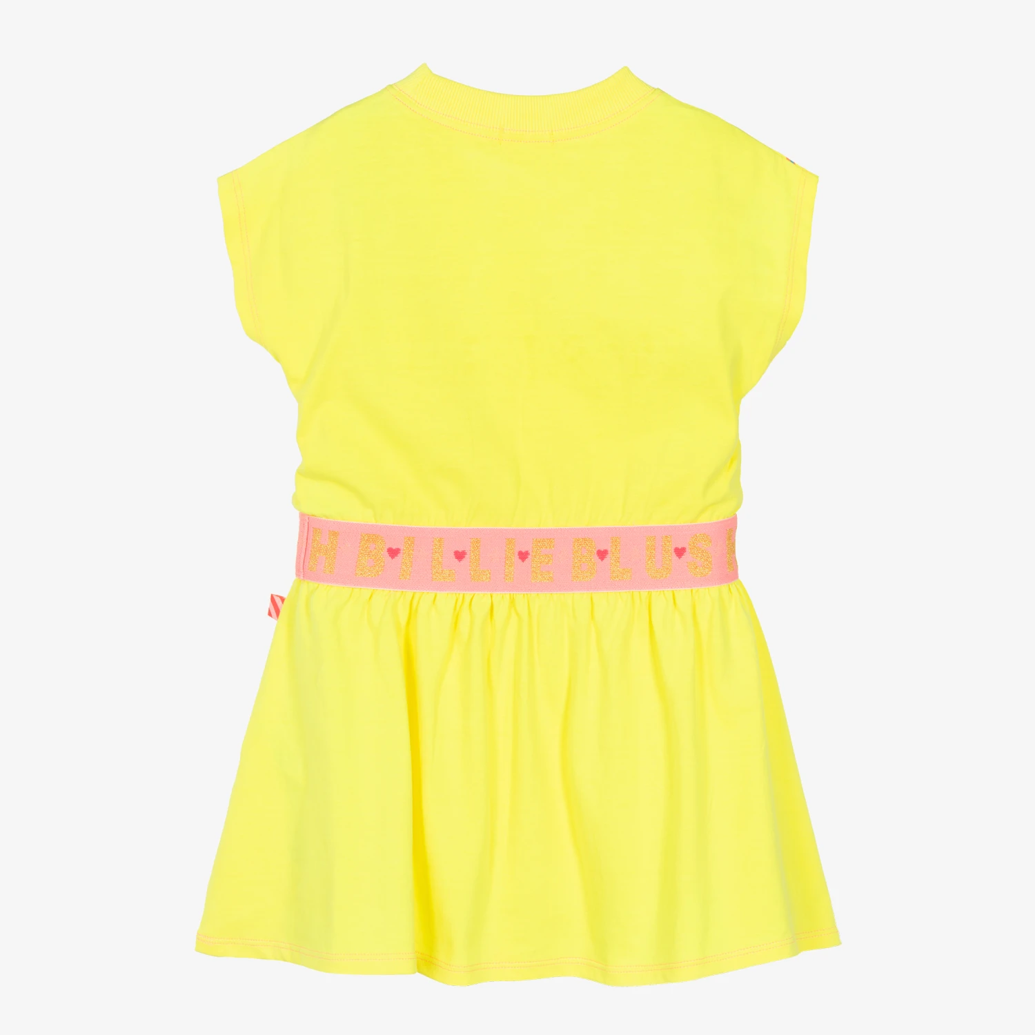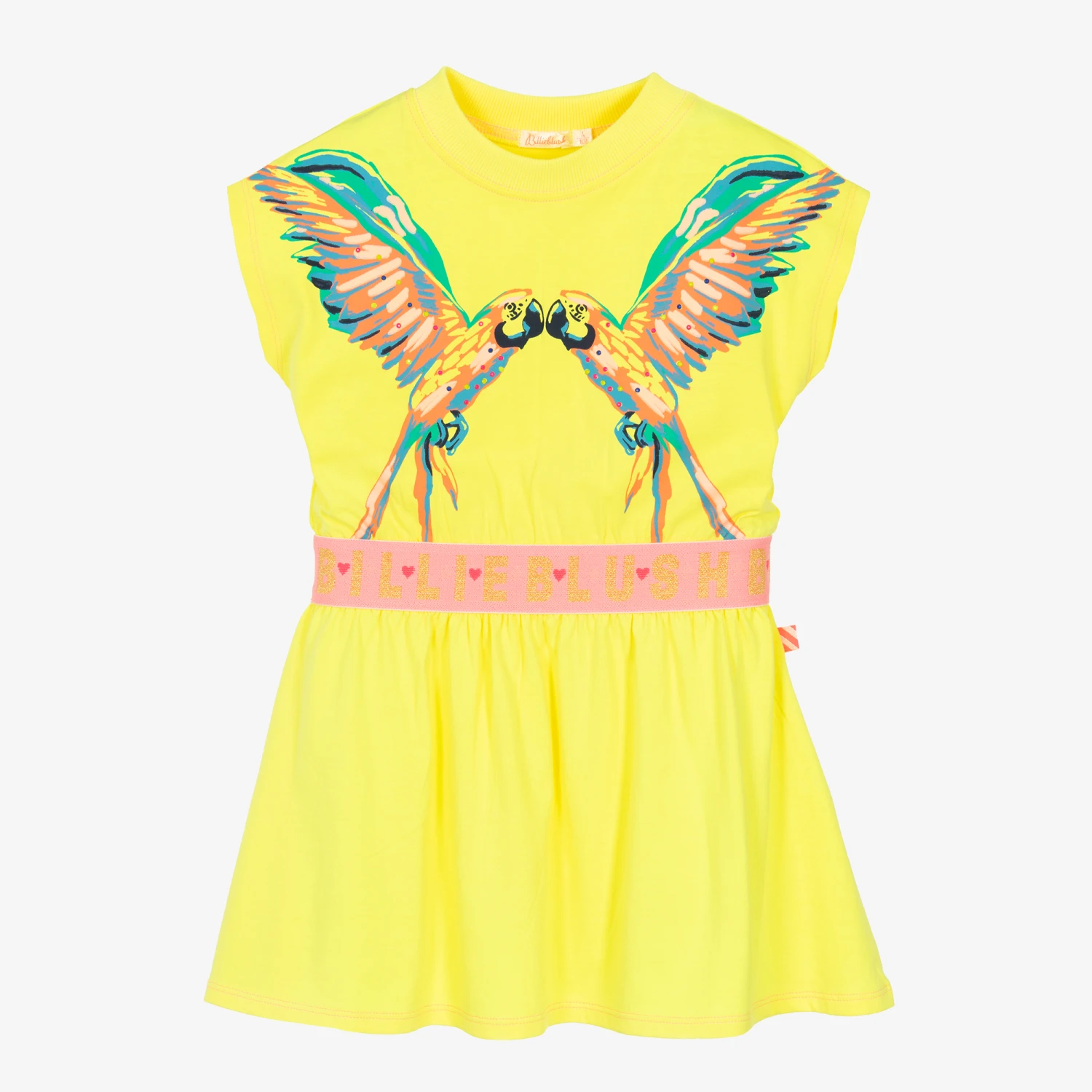 Make a bold statement in this neon yellow T-shirt dress for girls by Billieblush, made in the softest cotton jersey. Cool and casual, it has a colourful parrot design slogan printed on the front, with a neon pink elasticated waistband and the brand’s iconic tag logo on the side.