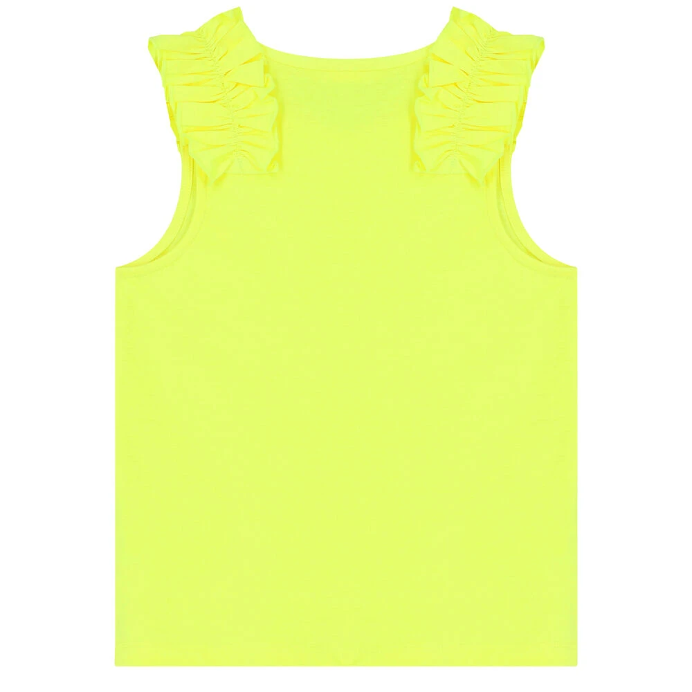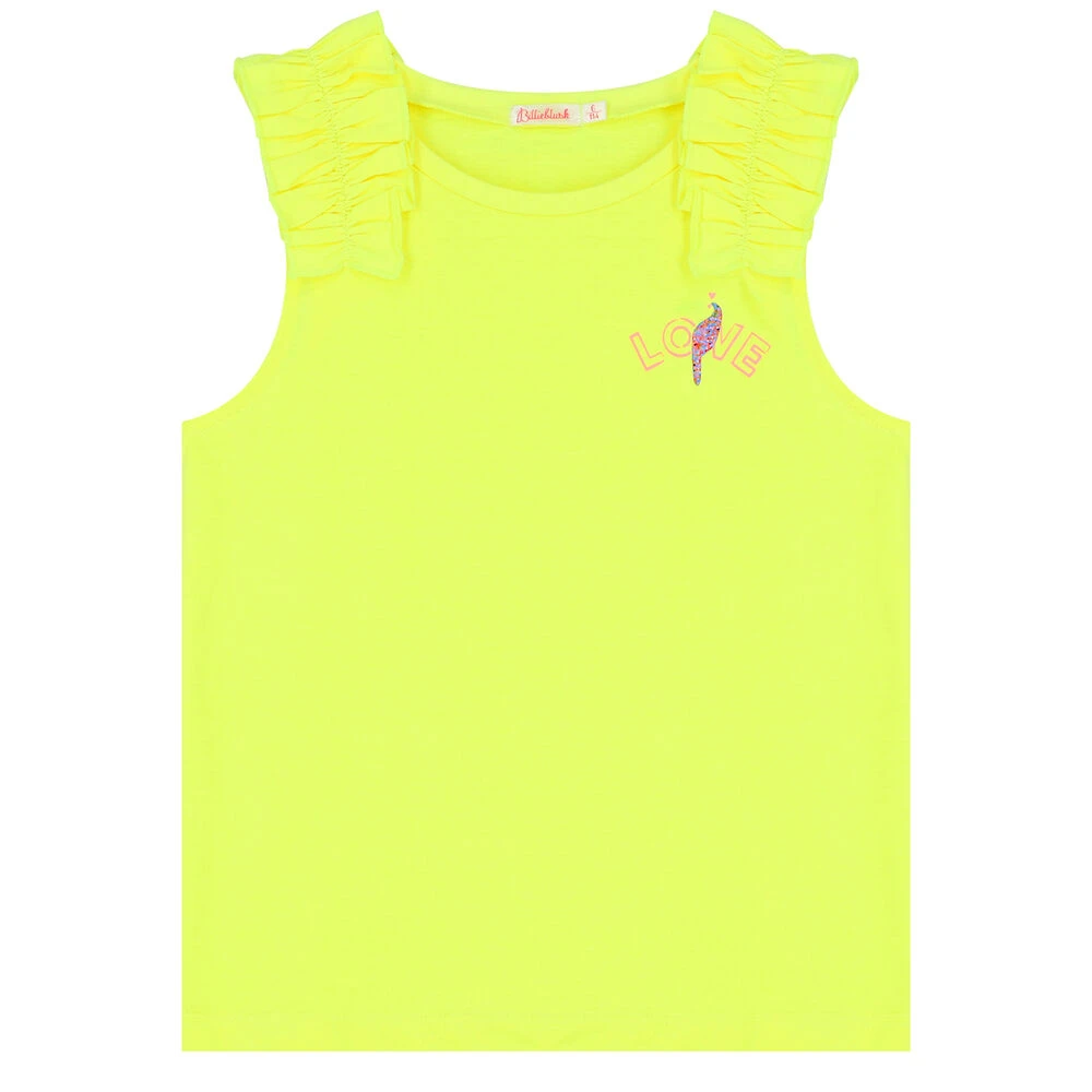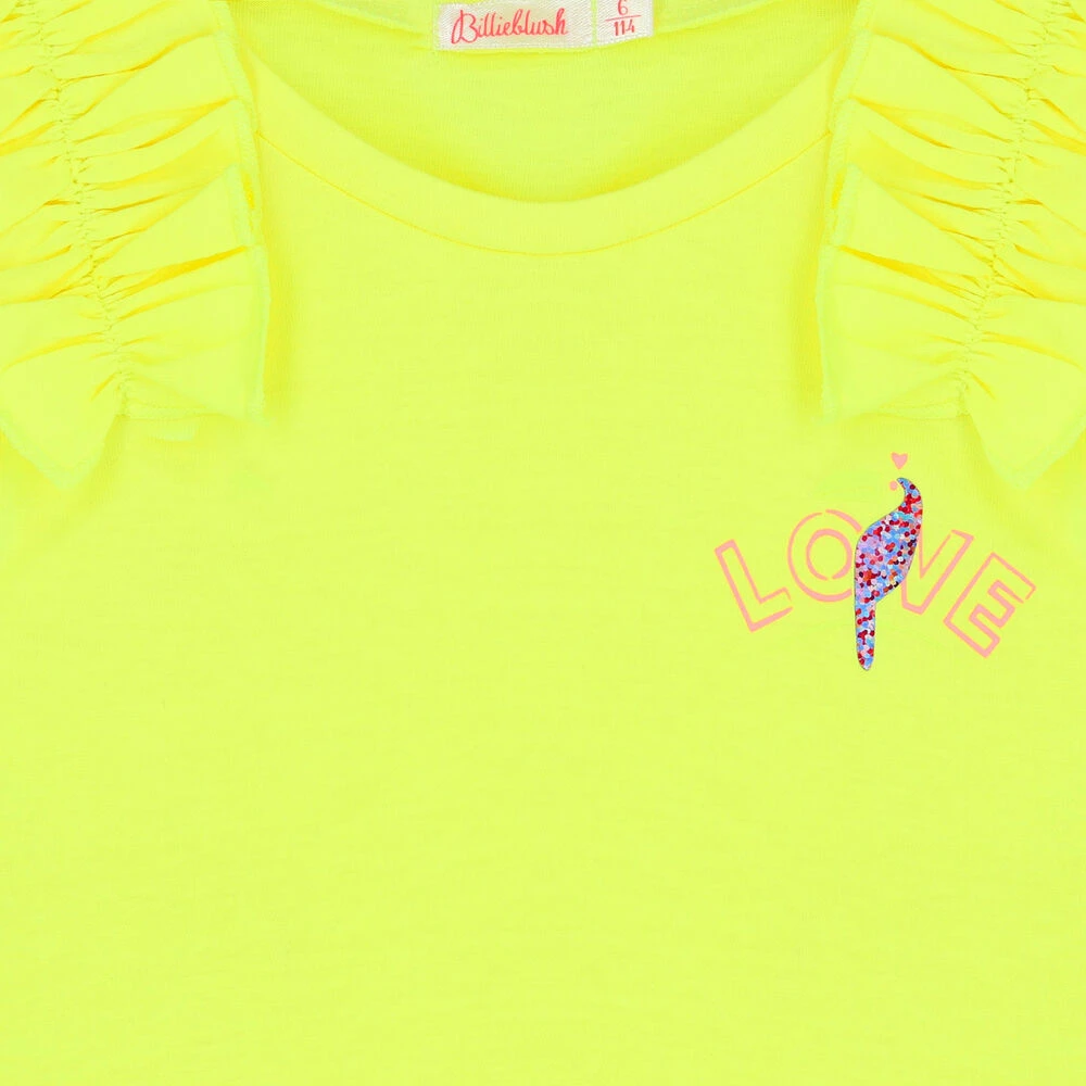 Yellow top for girls by BILLIEBLUSH. Made from soft silky polyester and cotton, it features a glittery toucan on the front and ruffle trims to the shoulders.
