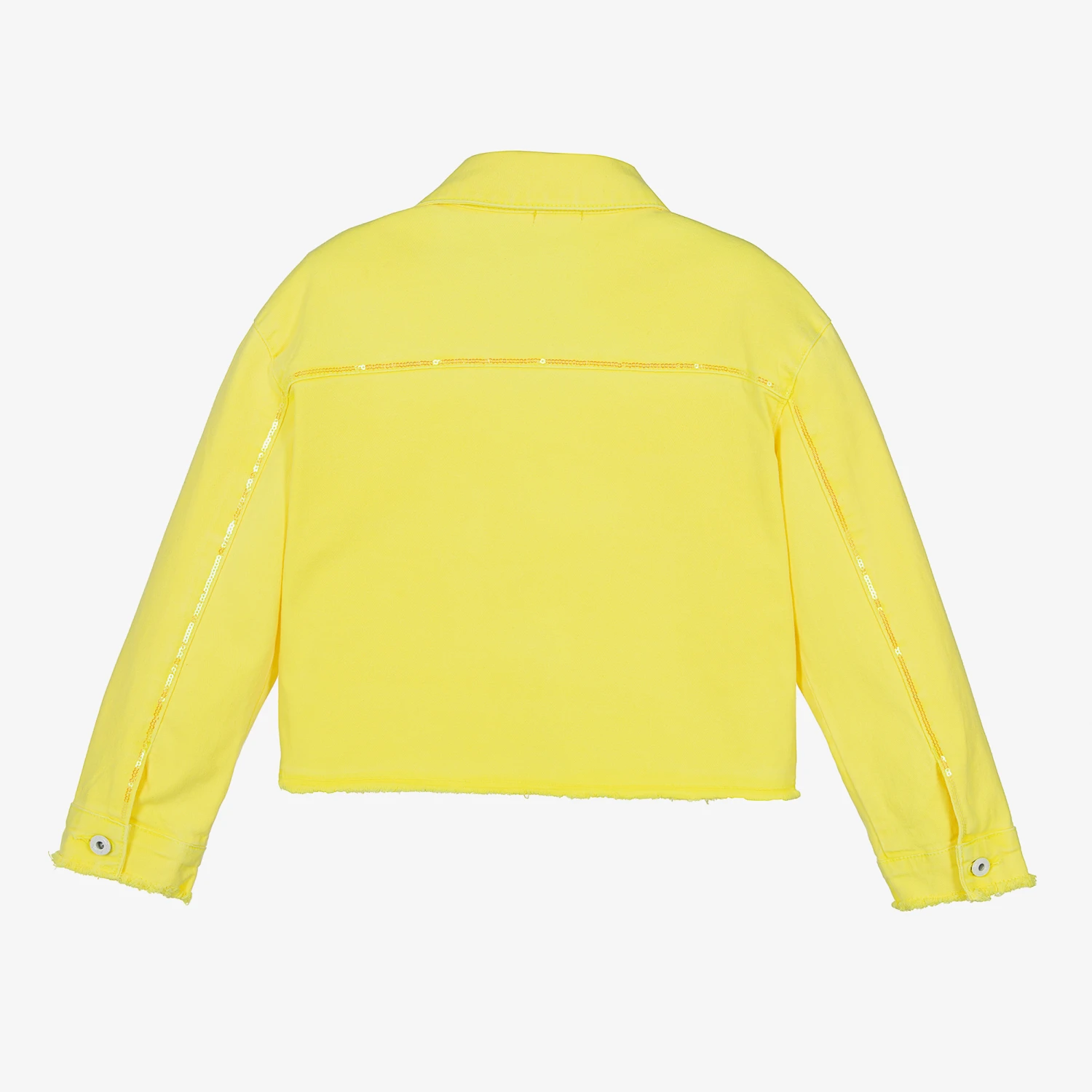 Bright yellow jacket for girls by Billieblush, made in soft cotton twill with frayed detailing. Cool and quirky, it has ‘LOVE’ sewn in iridescent sequins, with matching sequin trims on the sleeves, pockets and back. It fastens with white, glittery buttons on the front and cuffs, with popper fastenings on the pockets, back and sleeves.