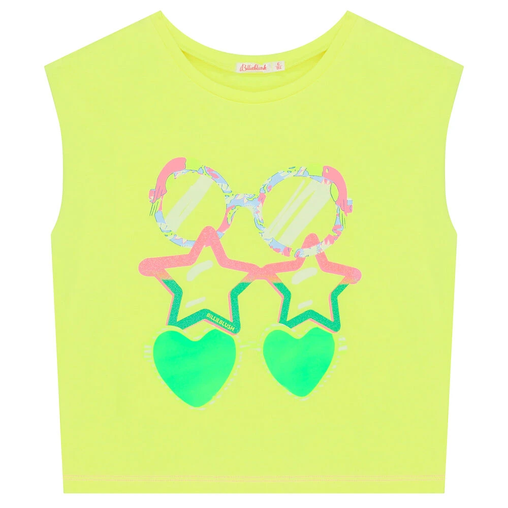 Yellow t-shirt for girls by Billieblush. Made from soft cotton jersey with a repeated colorful, glittery sunglasses print on the front.