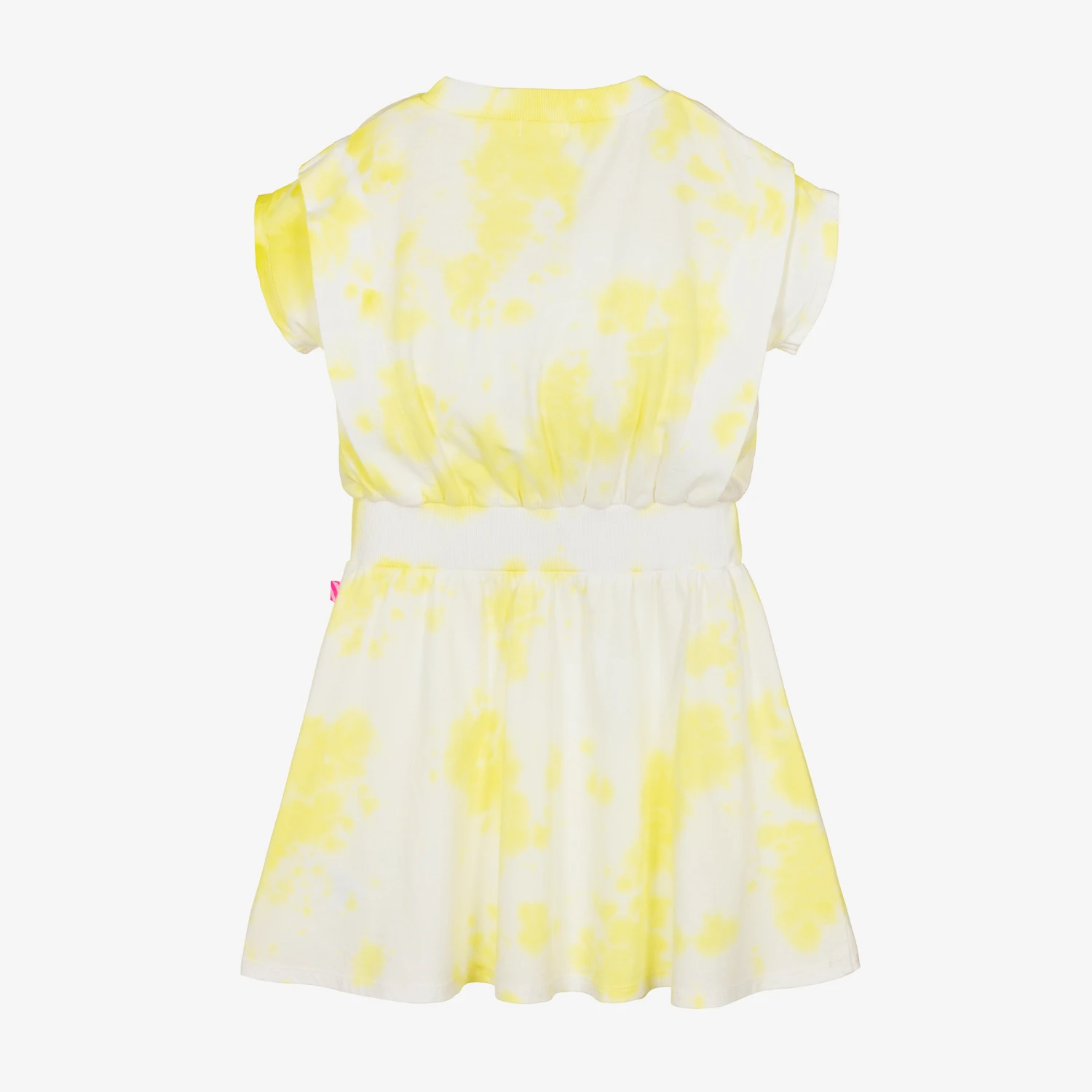 Casual yellow and white tie-dye T-shirt dress for girls by Billieblush, made in super soft cotton jersey. With a cool, modern spirit, it has a neon pink beach logo on the chest, double-layered sleeves and a glittery tag logo on the side. It has an elasticated waistband with a decorative sateen belt for a relaxed, slouchy fit.