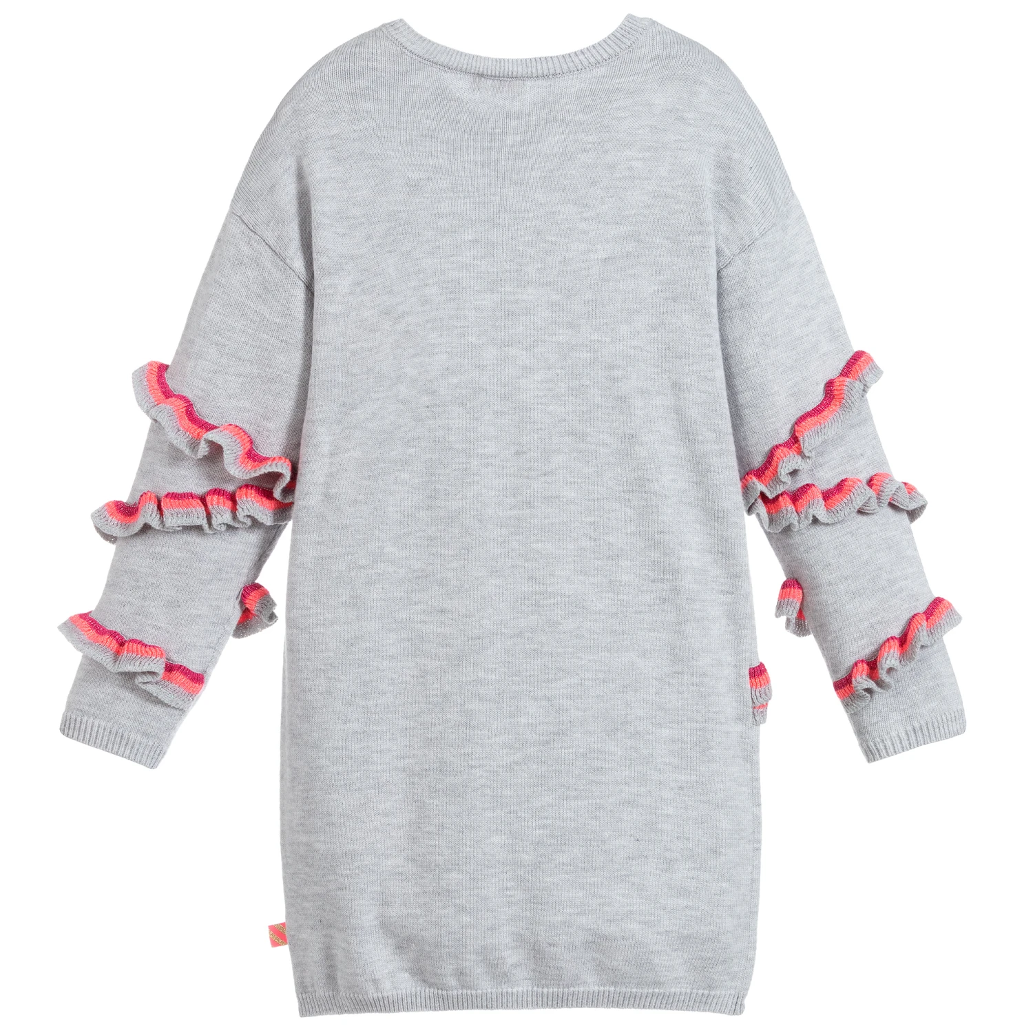 Grey dress for girls by Billieblush, knitted in a soft cotton and viscose blend. It has knitted ruffle trims with glittery pink stripes.