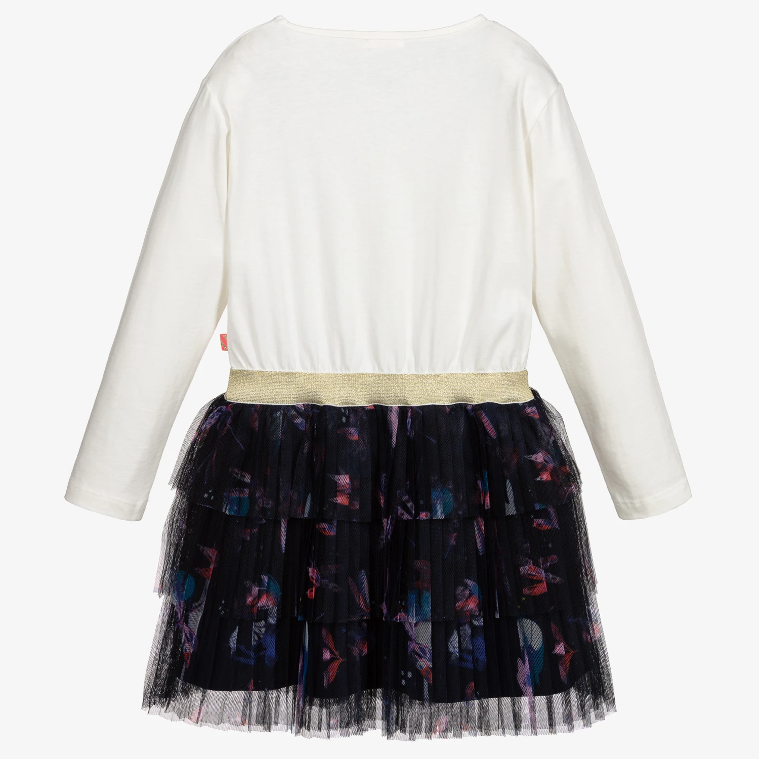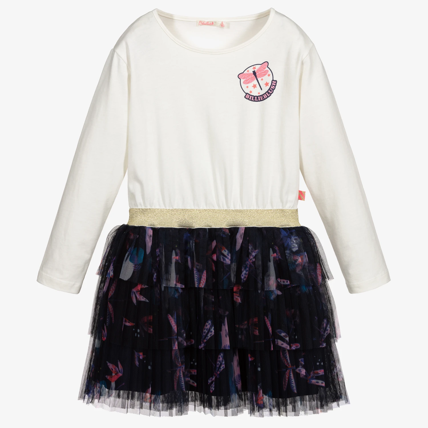 Girls ivory and navy blue dress by Billieblush. The cotton jersey top has a dragonfly logo print in pink and blue and a glittery gold, stretchy waistband. The navy blue skirt has a matching pink dragonfly print and is made from pleated layers of soft tulle with a lightweight viscose lining.