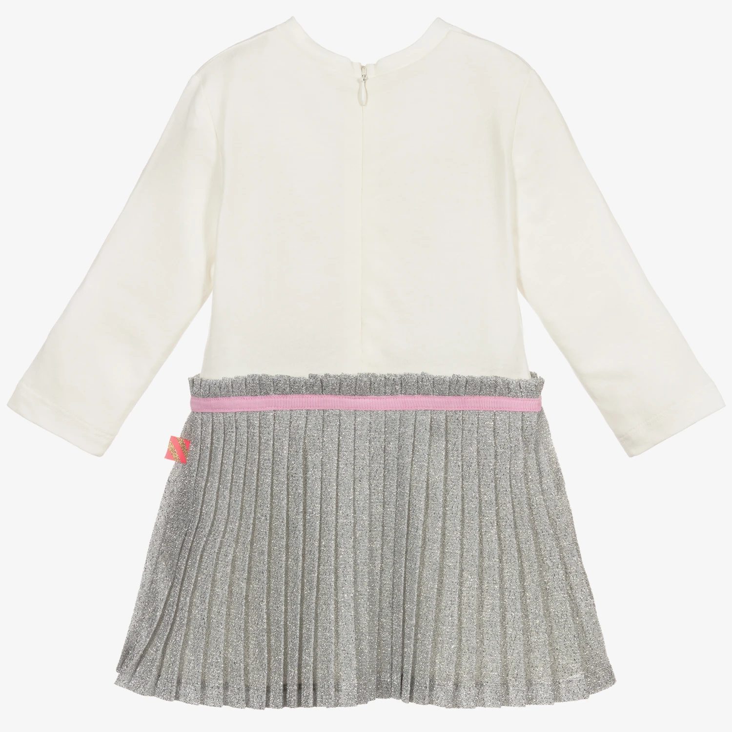 Ivory and silver dress for little girls by Billieblush. The bodice is made in soft cotton jersey, with a colourful dog print and neon pink logo. The glittery skirt is pleated and has pink trim around the waist. The dress has a concealed zip fastening on the back.