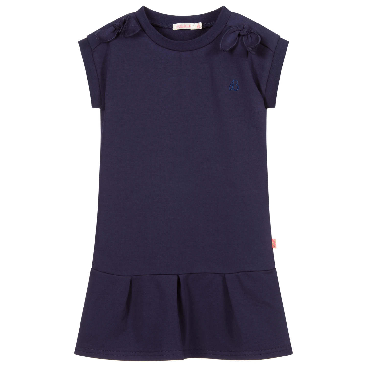Navy blue cotton sweatshirt jersey dress by Billieblush. Soft and stretchy, with a dropped hem and bow detail on one shoulder.