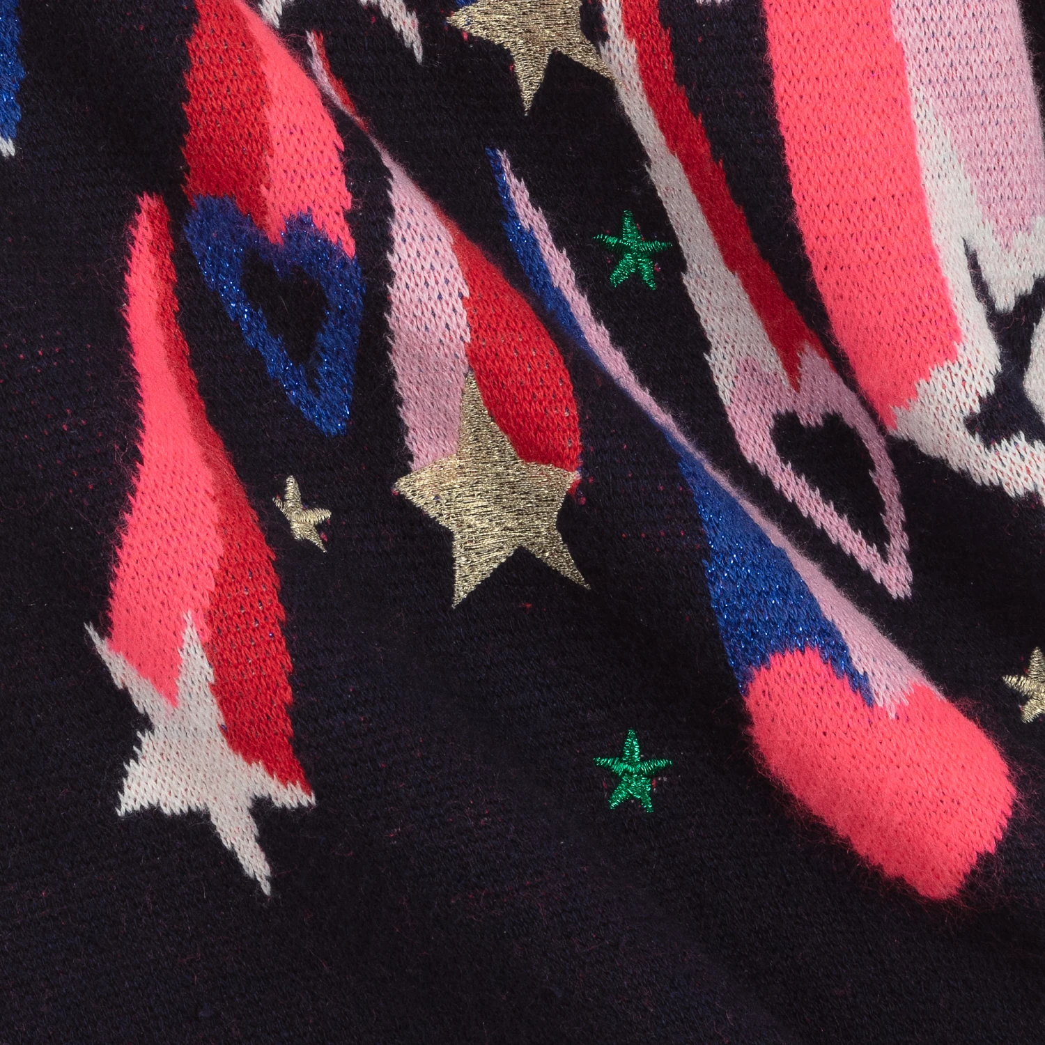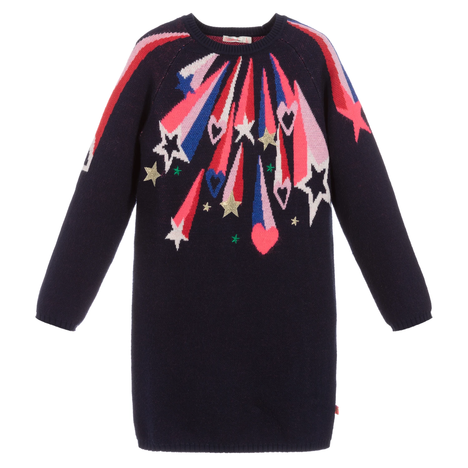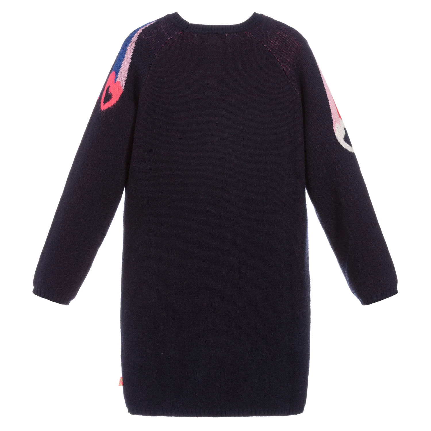 Navy blue dress for girls by Billieblush, knitted in a soft cotton and viscose blend. The front has a shooting star and heart design in neon pink, red, blue and gold.
